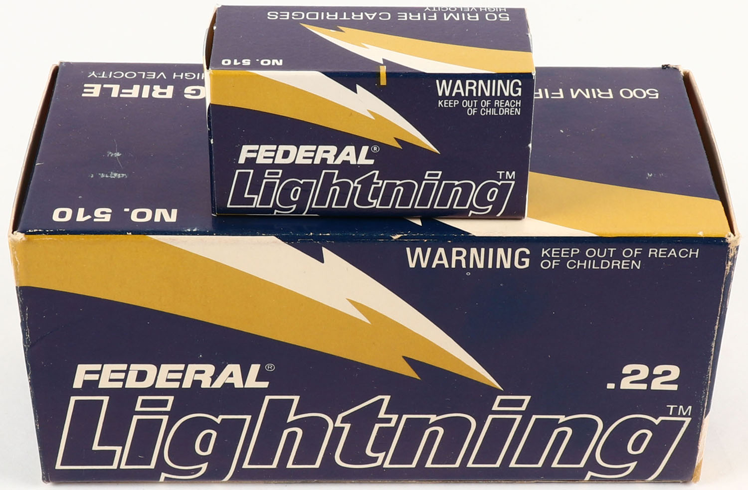 Federal, Lightning, .22 Long Rifle, Full, 500rds. 1pc. Blue white & gold brick, brick is near mint with minty color, only very minor corner wear, edges are crisp, end flaps are solid, inside boxes are minty. Grade: Excellent ++ - Value: 20 to 60