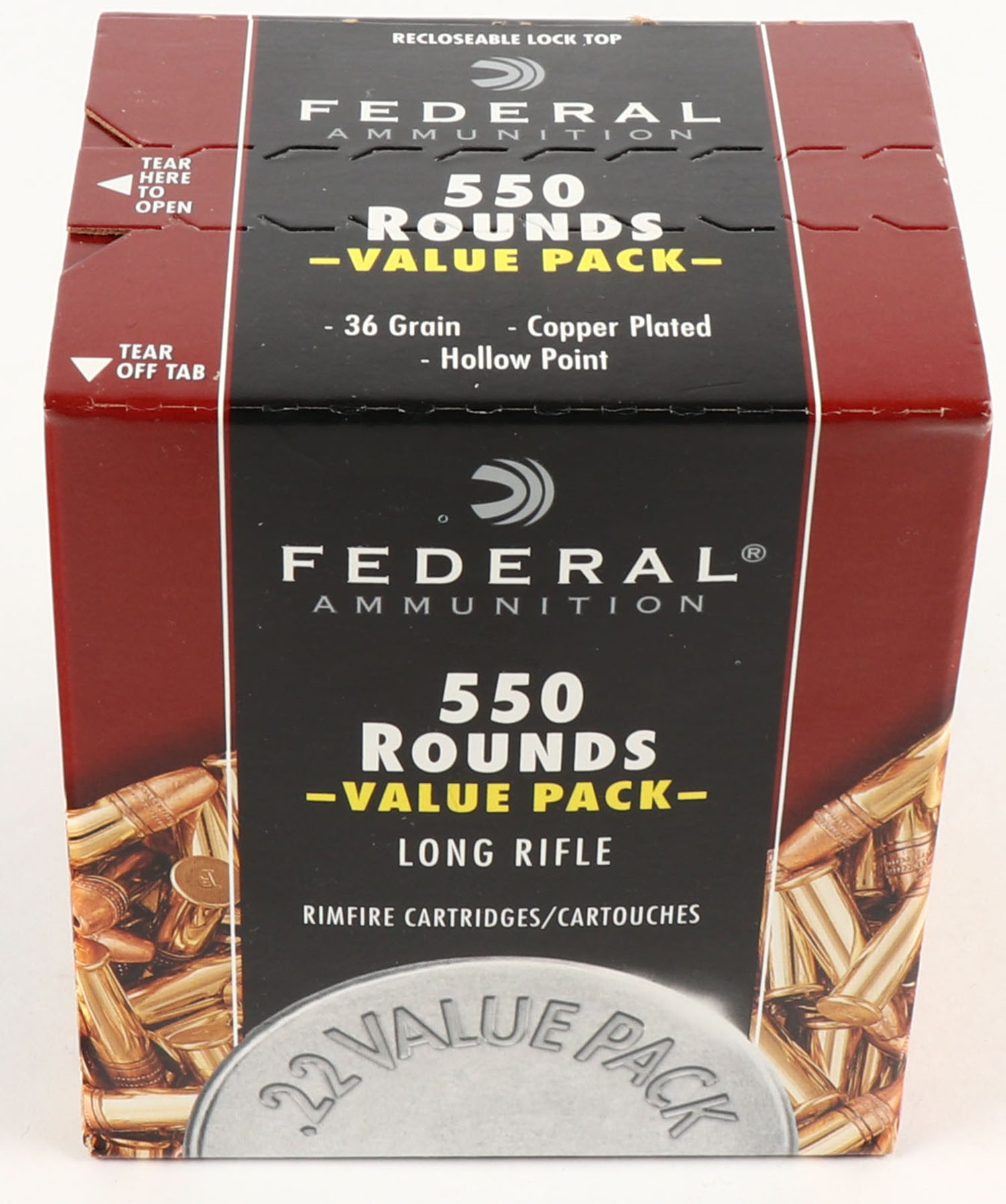 Federal, Value Pack, .22 Long Rifle, 36 Grain Copper Plated Hollow Point, FULL & SEALED, 550rds. 1pc. Multi-colored bulk box, box is MINT with minty color, corners are sharp, edges are crisp. Grade: MINT - Value: 10 to 50