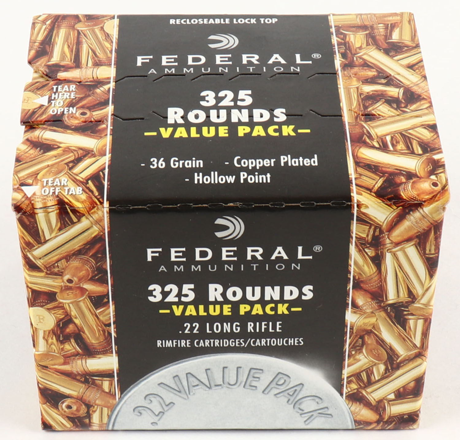 Federal, Value Pack, .22 Long Rifle, 36 Grain Copper Plated Hollow Point, FULL & SEALED, 1pc. Multi-colored box, box is MINT with mint color, corners are sharp, edges are crisp. Grade: MINT - Value: 10 to 50