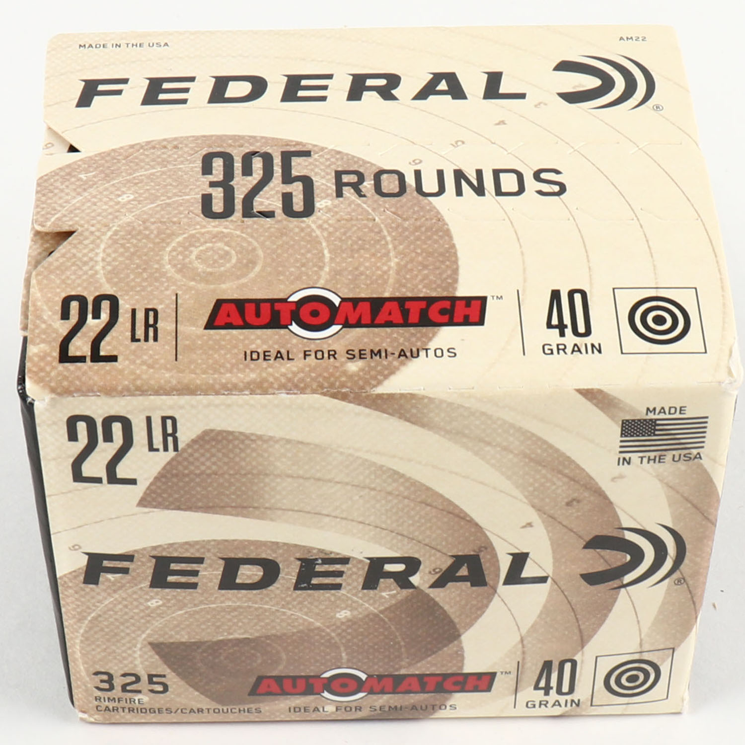 Federal, AutoMatch, .22 Long Rifle, Ideal for Semi-Autos, 40 Grain Solid, 1200 FPS, FULL & SEALED 325 rds. 1pc. Tan & black bulk box, box is near mint with minty color, corner wear, edges are crisp. Grade: Excellent ++ - Value: 10 to 50