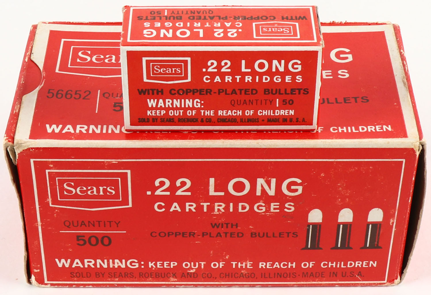 Sears, .22 Long, Copper Plated Bullets, Full, 500rds. 1pc. Red & white brick, brick is solid with excellent color, some shelf & corner wear, very minor edge wear, end flaps are solid, inside boxes are minty. Grade: Excellent + - Value: 40 to 120