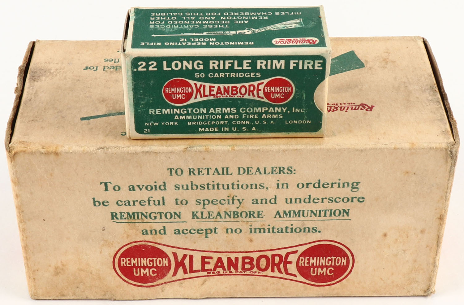 Remington, Kleanbore, .22 Long Rifle, Product Code: 21, Partial 9 boxes, 1pc. Buff dog bone brick, brick is solid with very good color, age soiling, some edge & corner wear, end flaps are solid, inside boxes are minty. Grade: Very Good ++ - Value: 120 to 360