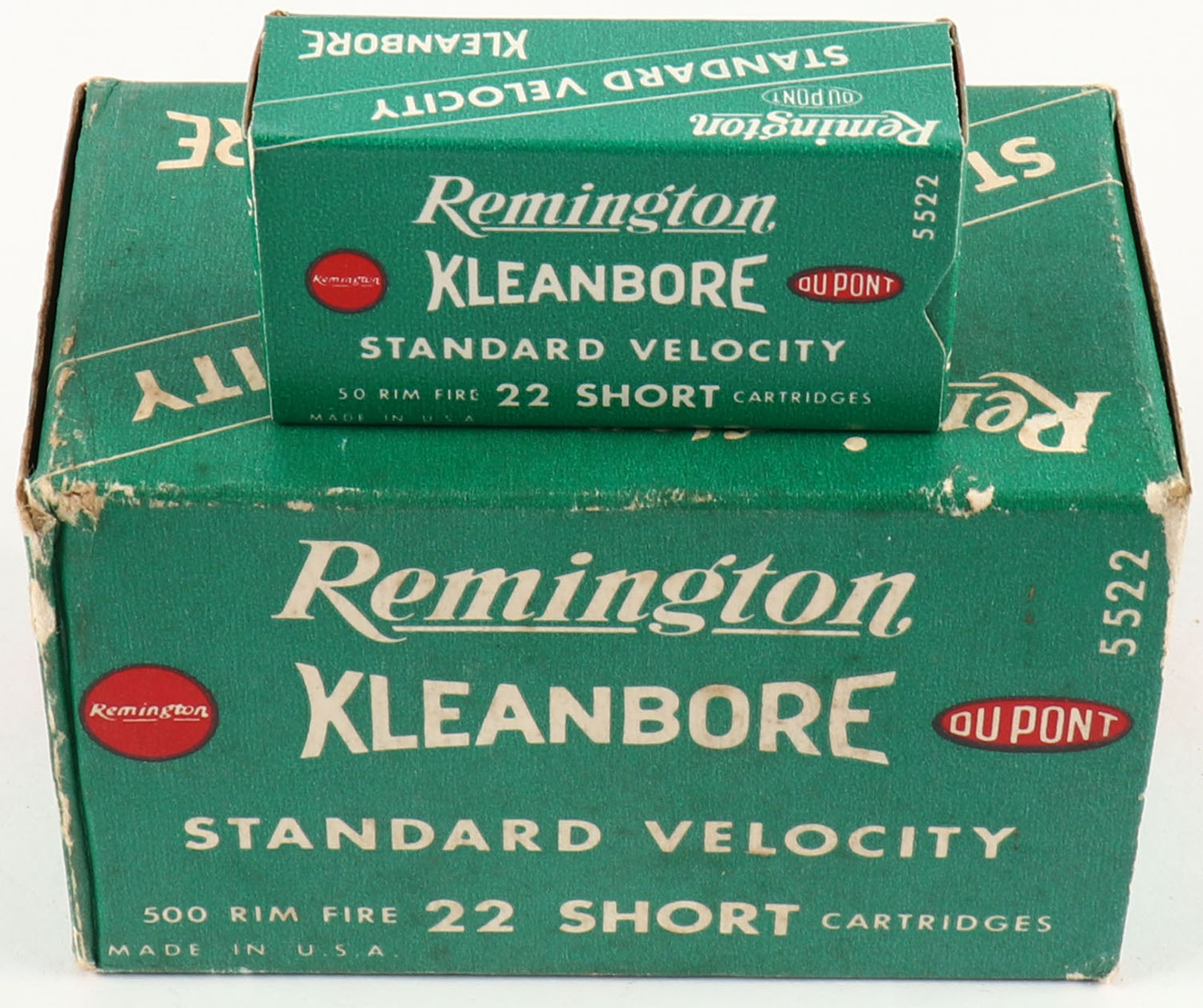 Remington, Kleanbore Standard Velocity, .22 Short, Full, 500rds. 1pc. Green white & red brick, brick is solid with excellent color, some edge & corner wear, end flaps are solid, inside boxes are minty. Grade: Excellent - Value: 40 to 120