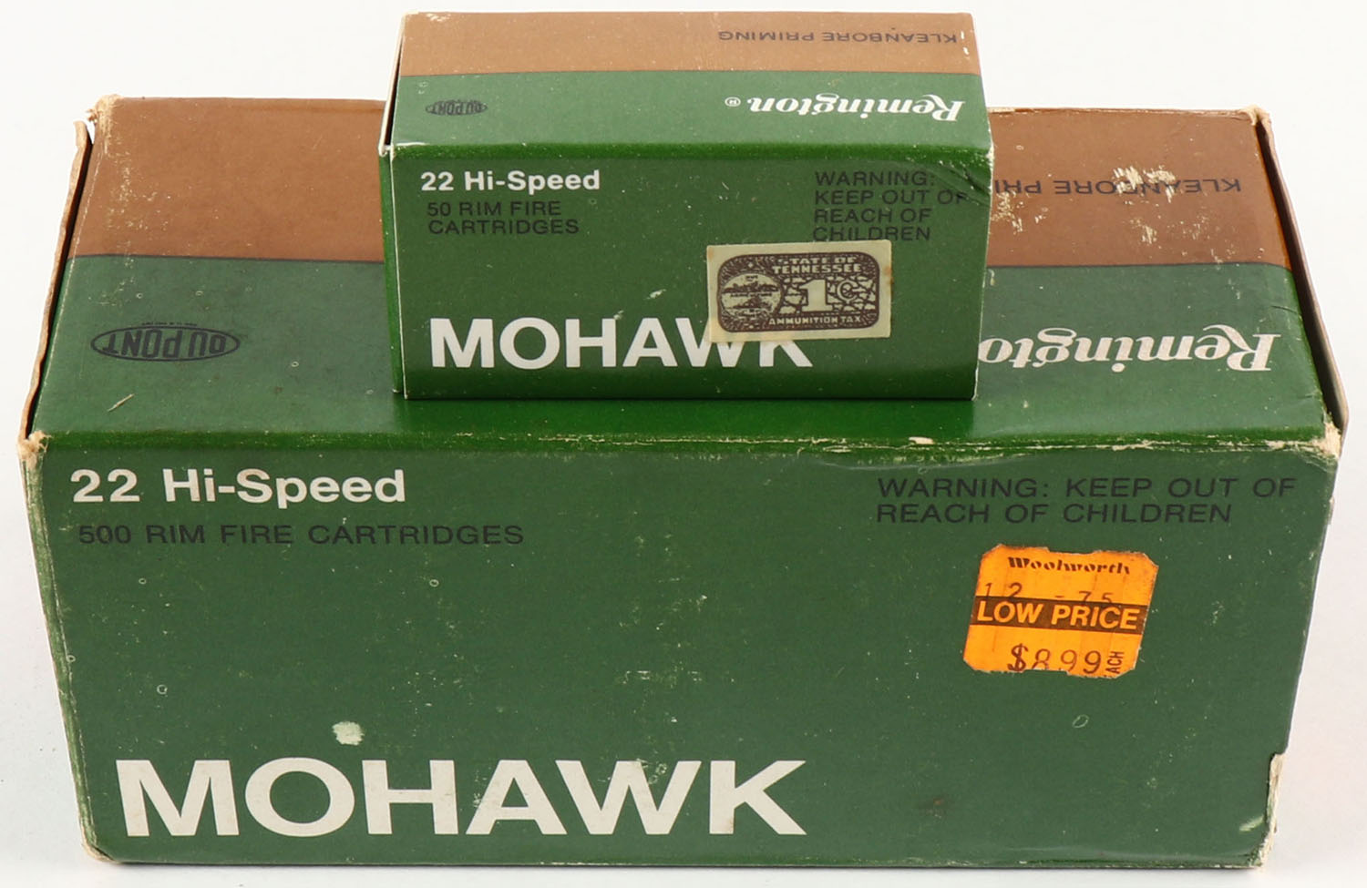 Remington, Mohawk, .22 Long Rifle, Hi-Speed, Full, 500rds., 1pc. Green & brown brick, brick is solid with excellent color, minor shelf wear, corner wear, minor edge wear, end flaps are solid, inside boxes are minty. Grade: Excellent - Value: 30 to 90