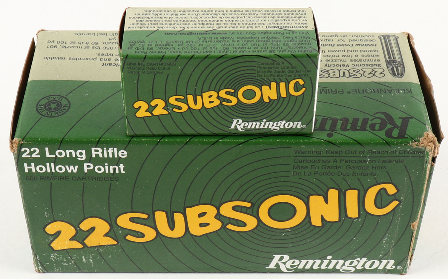 Remington, 22 Subsonic, .22 Long Rifle Hollow Point, Full, 500rds., 1pc. Green gray & yellow brick, brick is solid with excellent color, very minor shelf wear, some corner wear, edges are mostly crisp, end flaps are solid, inside boxes are minty. Grade: Excellent - Value: 30 to 90