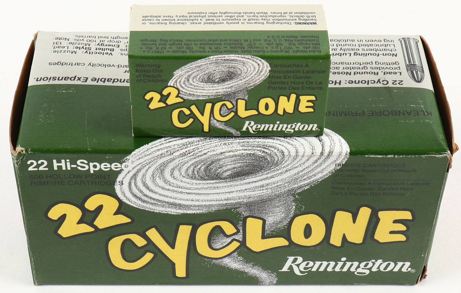 Remington, 22 Cyclone, .22 Long Rifle Hollow Point, Full, 500rds., 1pc. Green gray & yellow brick, brick is solid with excellent color, very minor shelf & corner wear, edges are mostly crisp, end flaps are solid, inside boxes are minty. Grade: Excellent + - Value: 30 to 90