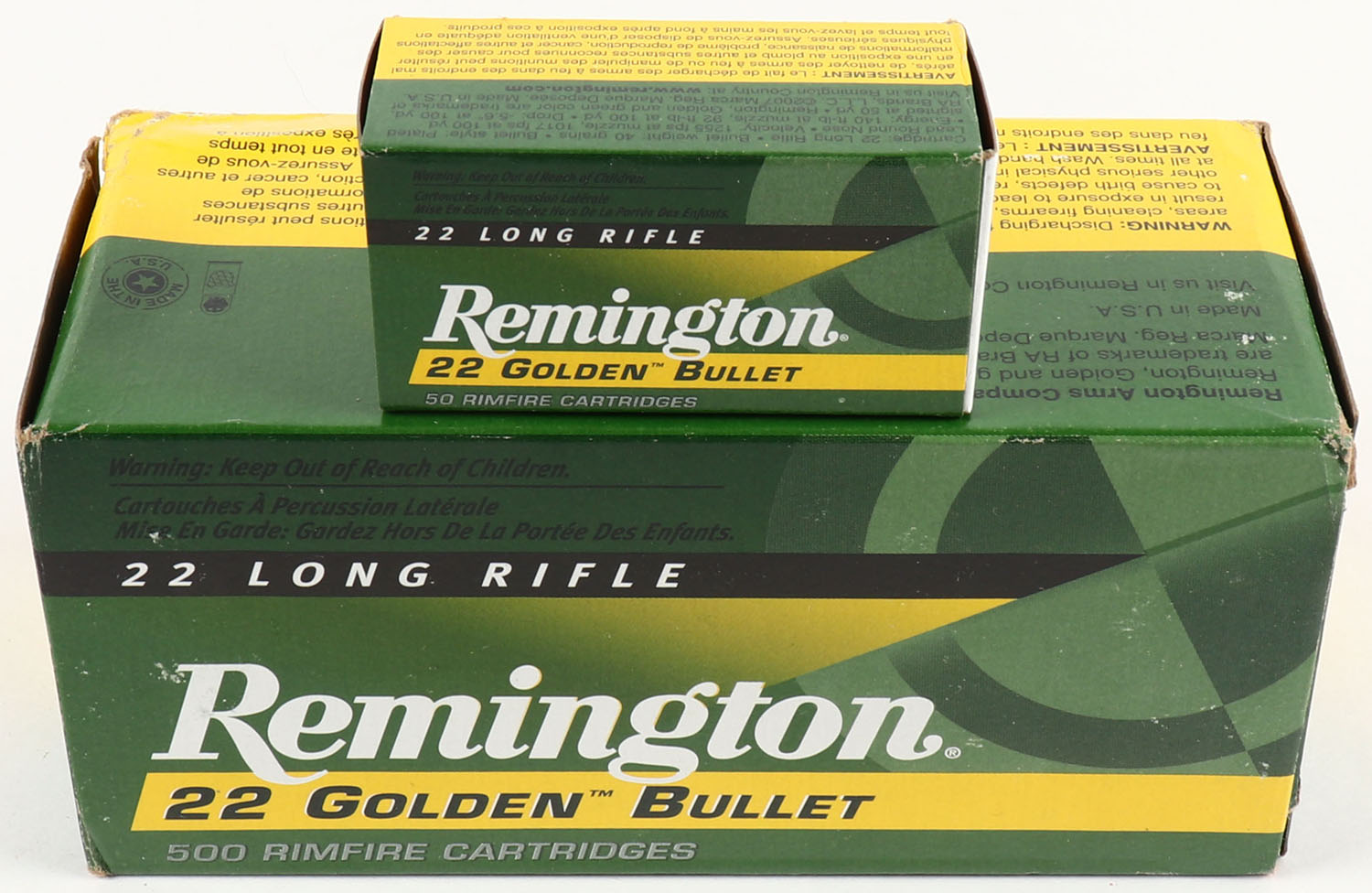 Remington, 22 Golden Bullet, .22 Long Rifle, High Velocity, Plated Round Nose, Full, 500rds., 1pc. Green & yellow brick, brick is solid with minty color, minor corner wear, edges are mostly crisp, end flaps are solid, inside boxes are minty. Grade: Excellent + - Value: 30 to 90