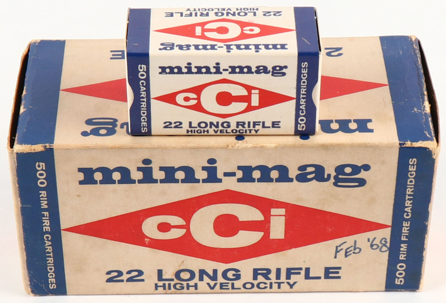 CCi, mini-mag, .22 Long Rifle, High Velocity, Full, 500rds. 1pc. White blue & red brick, brick is solid with very good color, age soiling, top has been written on, some corner wear, minor edge wear, end flaps are solid, inside boxes are minty. Grade: Very Good ++ - Value: 30 to 90
