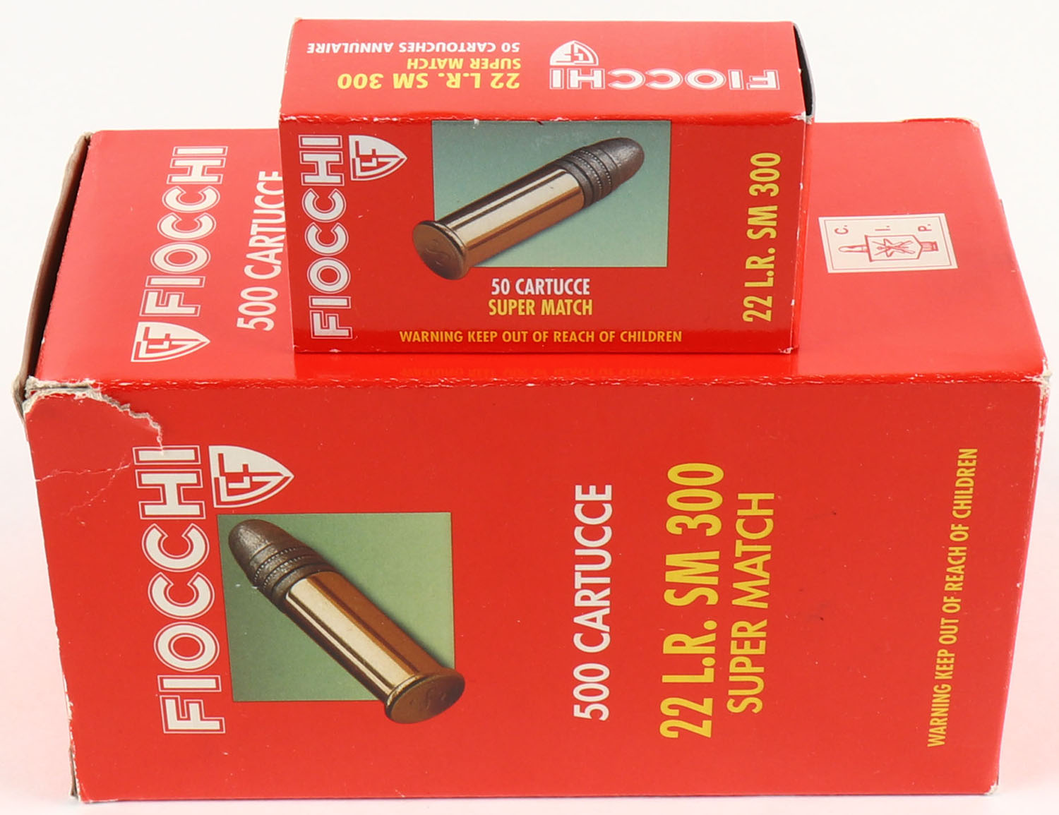 Fiocchi, Super Match 300, .22 Long Rifle, Full, 500rds., 1pc. Red & yellow brick, brick is solid with minty color, small tear on top, minor corner wear, edges are mostly crisp, end flaps are solid, inside boxes are mint. Grade: Excellent ++ - Value: 40 to 120