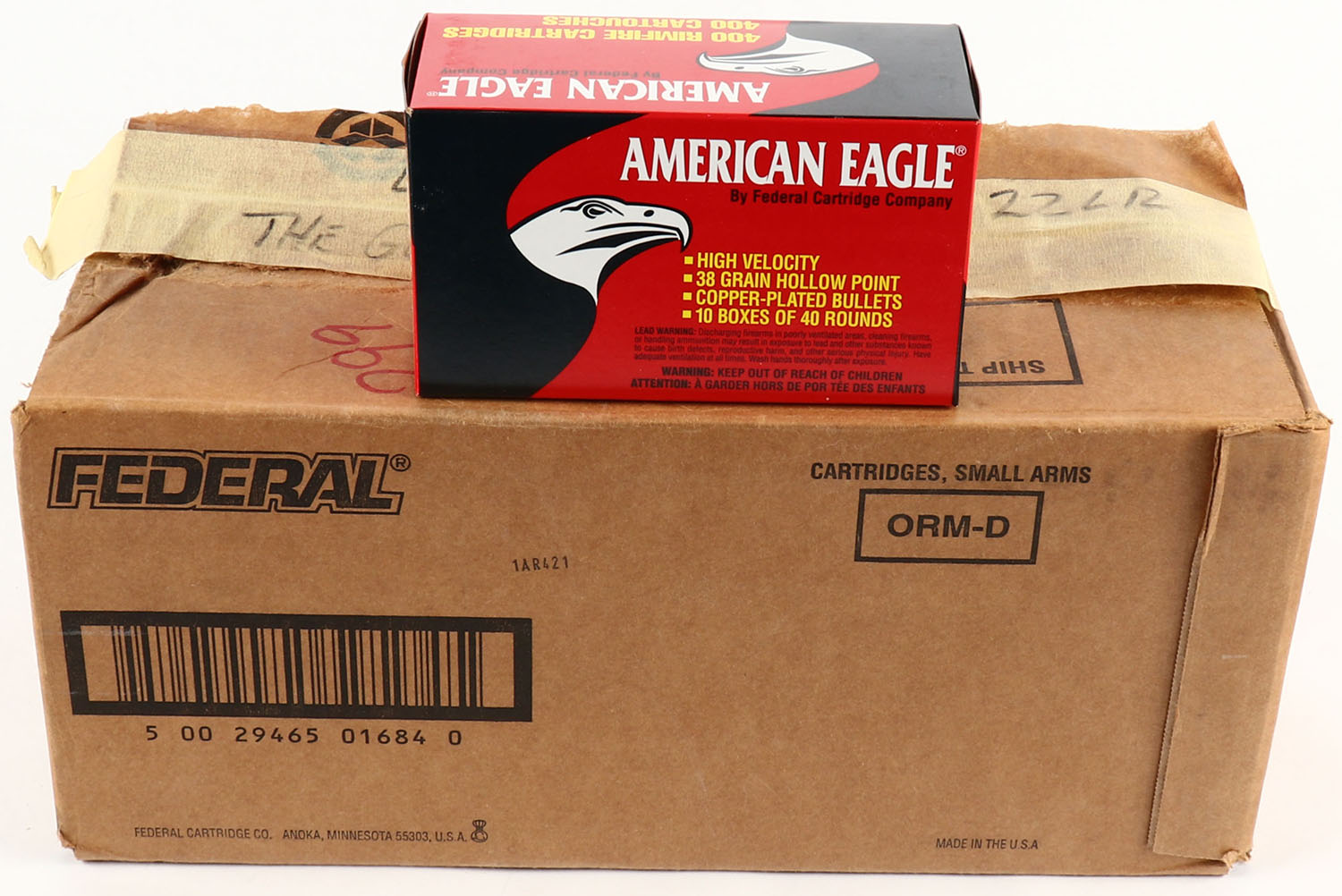 Federal, American Eagle, .22 Long Rifle, 38 Grain Hollow Point, High Velocity, Full, 4,000rds. Case of (10) 400rd. Bricks, bricks are MINT. Grade: MINT - Value: 150 to 450