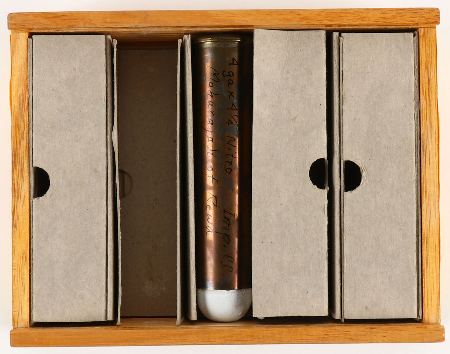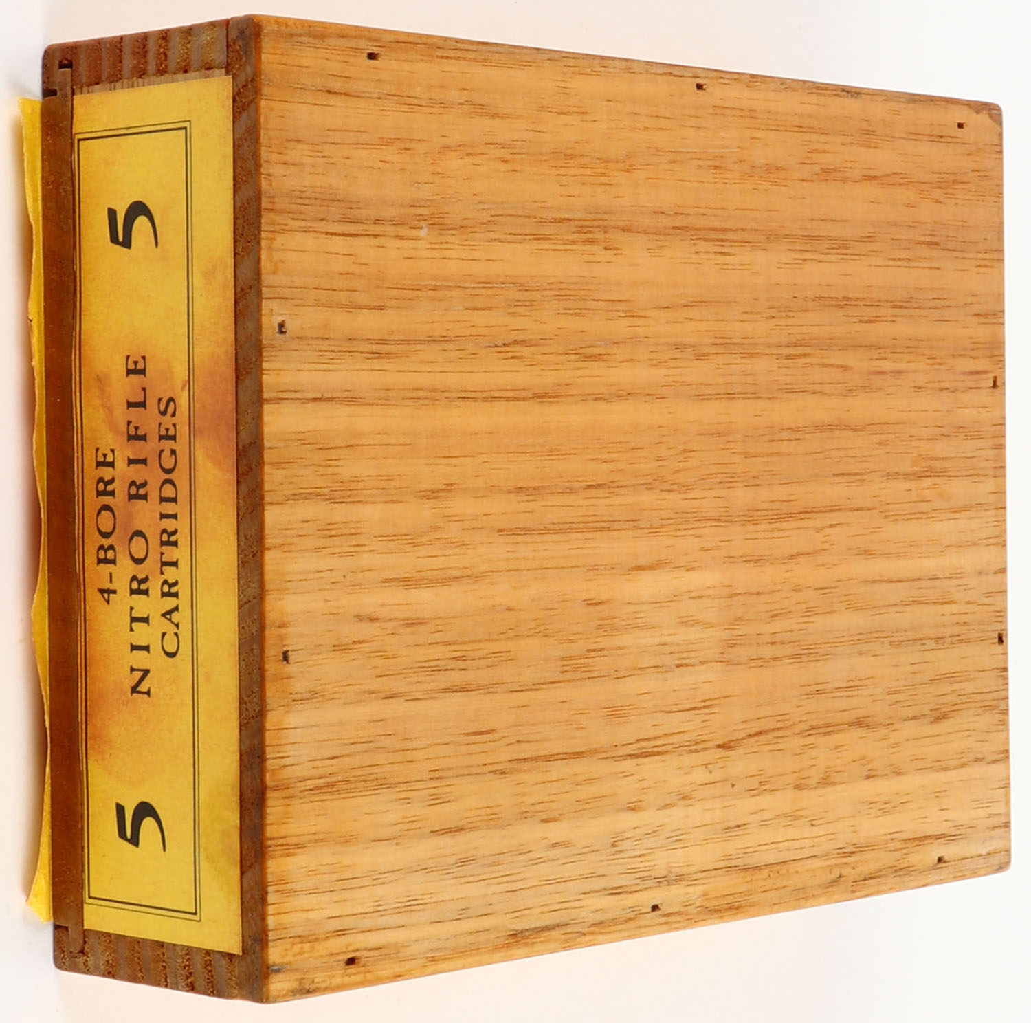 Imperial Cartridge Company, Specially Loaded Nitro Cartridges, 4-Bore, 4 1/4'' Case, 1960 Grain Bullets, Partial 1rd. 2pc. Wood box with yellow & black wraparound reproduction(?) label, box is solid with very good to excellent color, the cartridges case has been written on, and the lead appears to have been coated in a protective white paint. Grade: Very Good ++ - Value: 200 to 600
