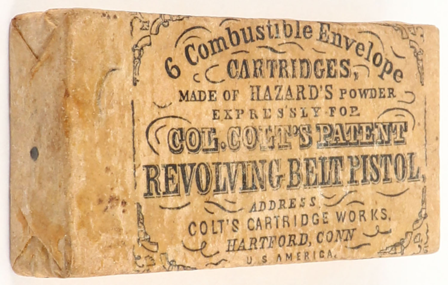 Colt's Cartridge Works, 6 Combustible Envelope Cartridges, Expressly for Col. Colt's Patent Revolving Belt Pistol, FULL & SEALED, 1pc. Buff packet with black printing, packet is solid with very good color, some shelf wear, corners are sharp. Grade: Excellent - Value: 150 to 450