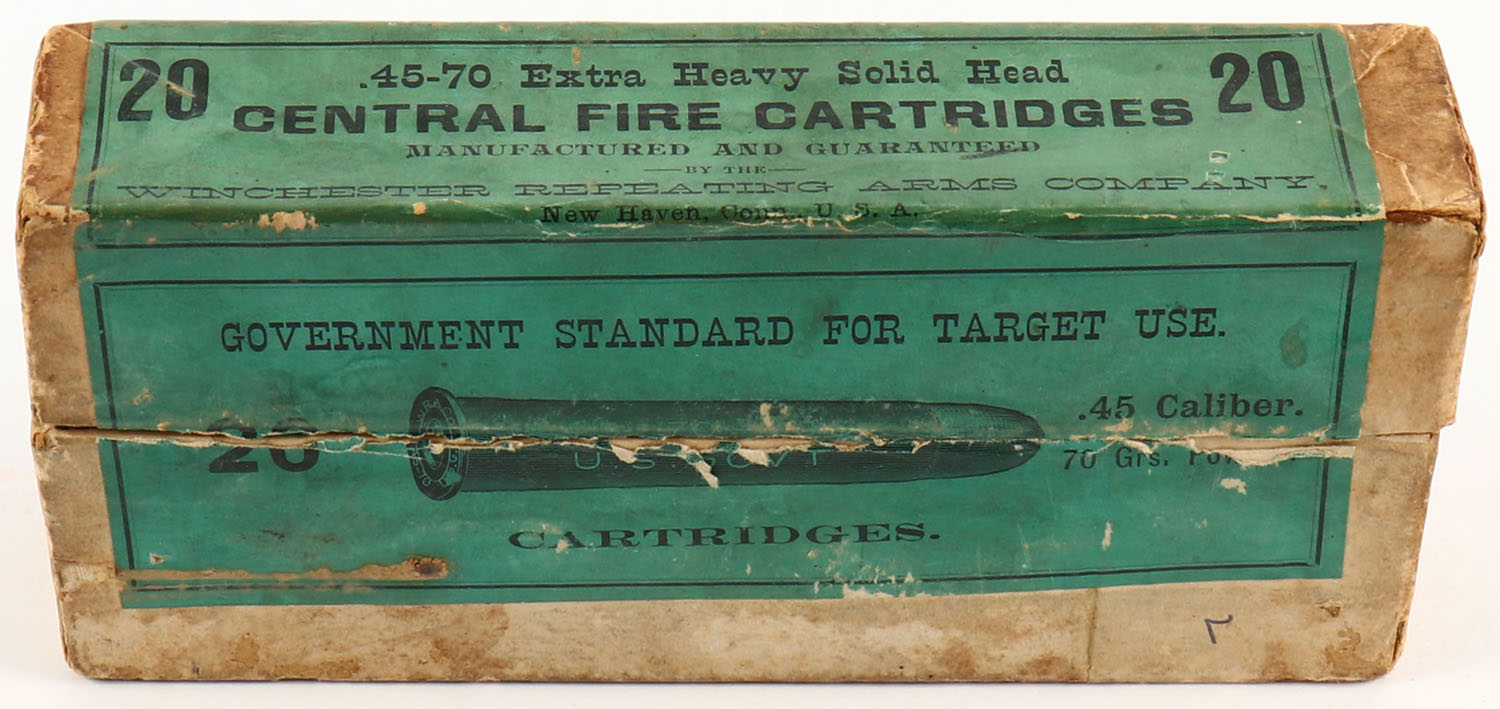 Winchester, Central Fire Cartridges, .45-70-405 U.S. Gov't, Extra Heavy Solid Head, Partial 11rds., 2pc. Buff box with green label, box is solid with very good color, some age soiling & corner wear, left end has been written on, minor edge wear, label is solid, ammo is excellent. Grade: Very Good ++ - Value: 30 to 90