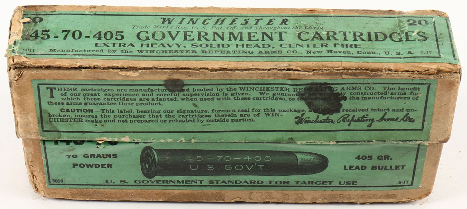 Winchester, Government Cartridges, .45-70-405 U.S. Gov't, Full, 2pc. Buff box with green label, bottom of box is completely torn, label is sealed, very good color, some staining, edge & corner wear, partial seam split to top left edge, ammo appears very good. Grade: Good - Value: 30 to 90