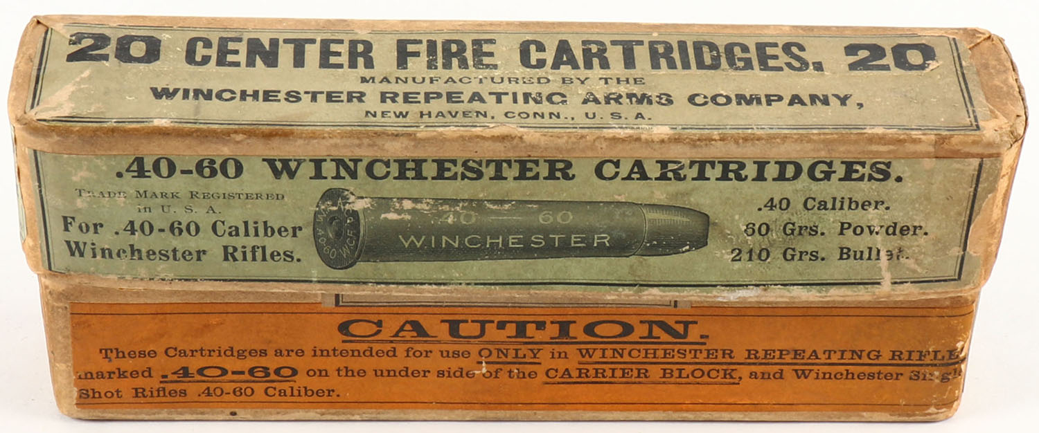 Winchester, Center Fire Cartridges, .40-60 Winchester, 210 Grain Bullet, Full, 1pc. Buff box with green & orange labels, box is solid with very good color, some color fading & shelf wear, some edge & corner wear, labels are intact, ammo is excellent. Grade: Excellent - Value: 80 to 240
