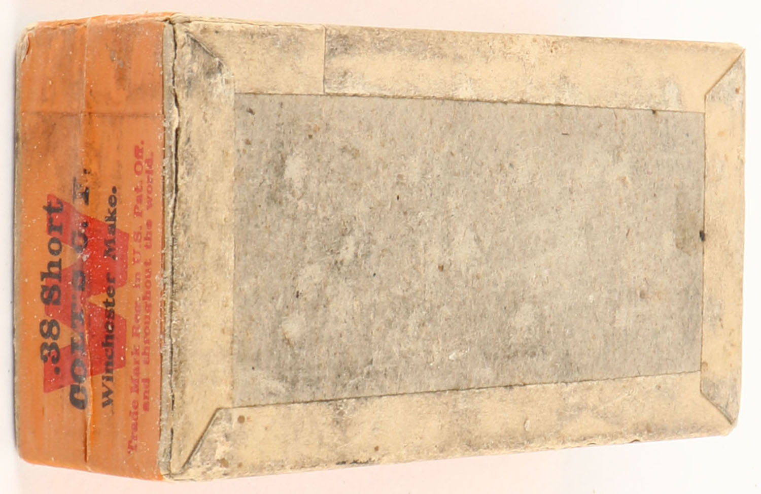 Winchester, Center Fire, .38 Short Colt, FULL & SEALED, 2pc. Buff box with green top & orange side sealing labels, box is solid with excellent color, very minor age soiling, very minor edge & corner wear, label is intact, partially unsealed on back side. Grade: Excellent - Value: 50 to 150