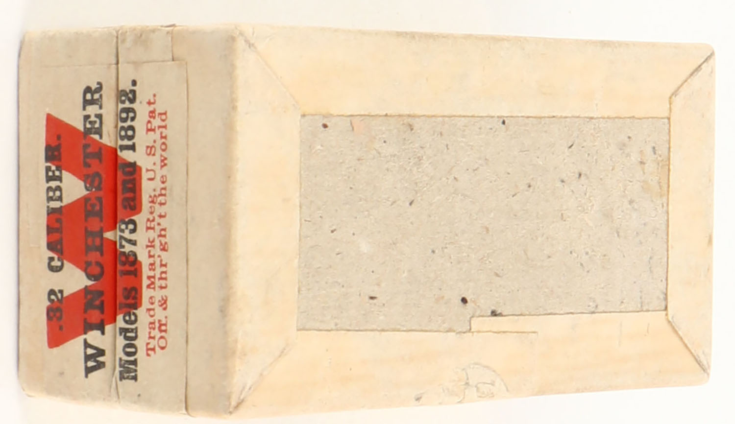 Winchester, .32 Winchester, Solid Head, FULL & SEALED, 1pc. Buff box with green top & buff side sealing labels, box is solid with excellent color, very minor age soiling, stain on front, corners are mostly sharp, edges are mostly crisp, labels are intact. Grade: Excellent ++ - Value: 150 to 450