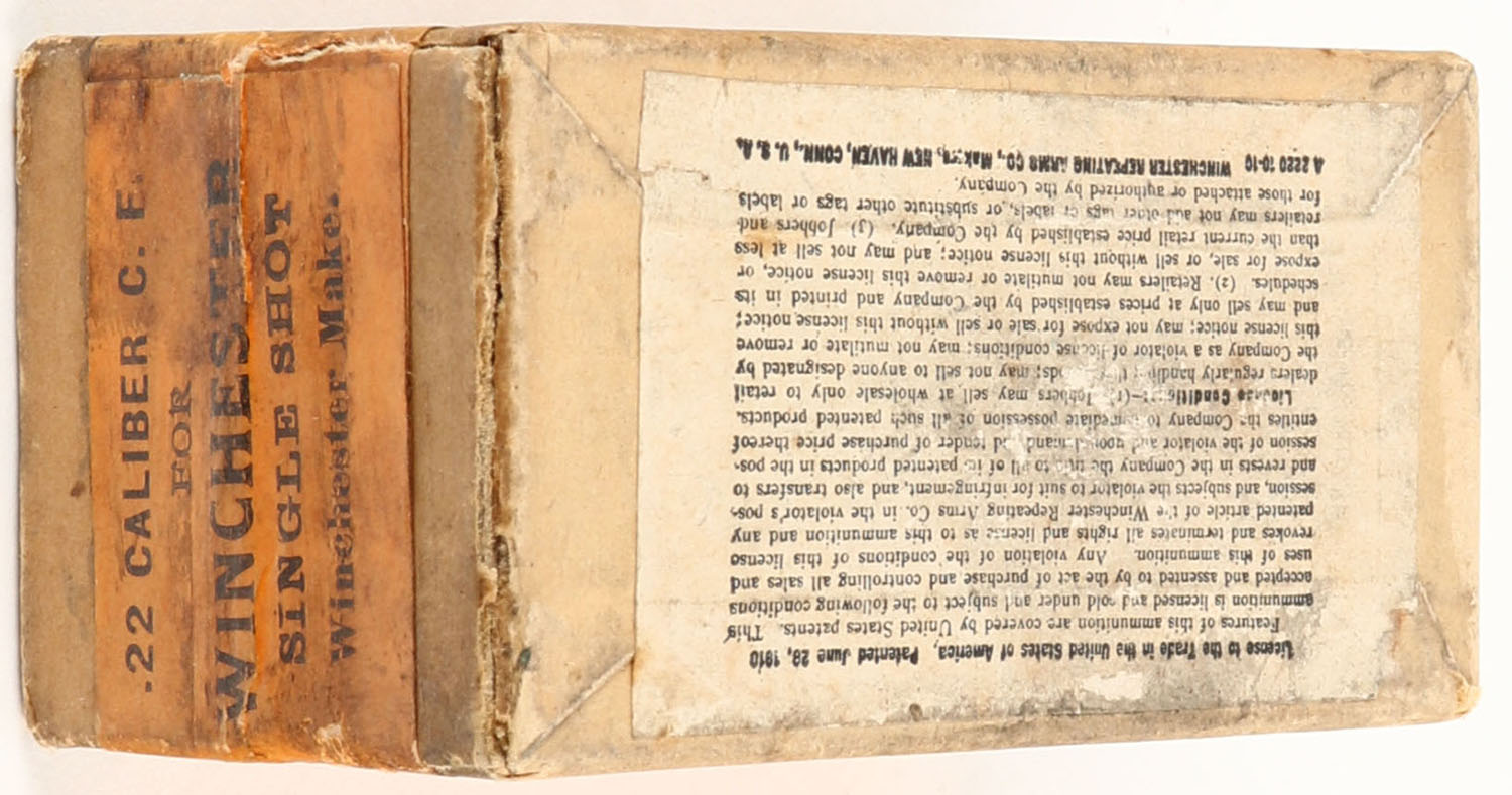 Winchester, Center Fire Cartridges, .22 Winchester Single Shot, 45 Grain Solid Head, FULL & SEALED, 2pc. Buff box with green top & orange side sealing labels, box is solid with excellent color, minor age soiling & staining, minor corner wear, edges are mostly crisp, labels are intact. Grade: Excellent - Value: 150 to 450