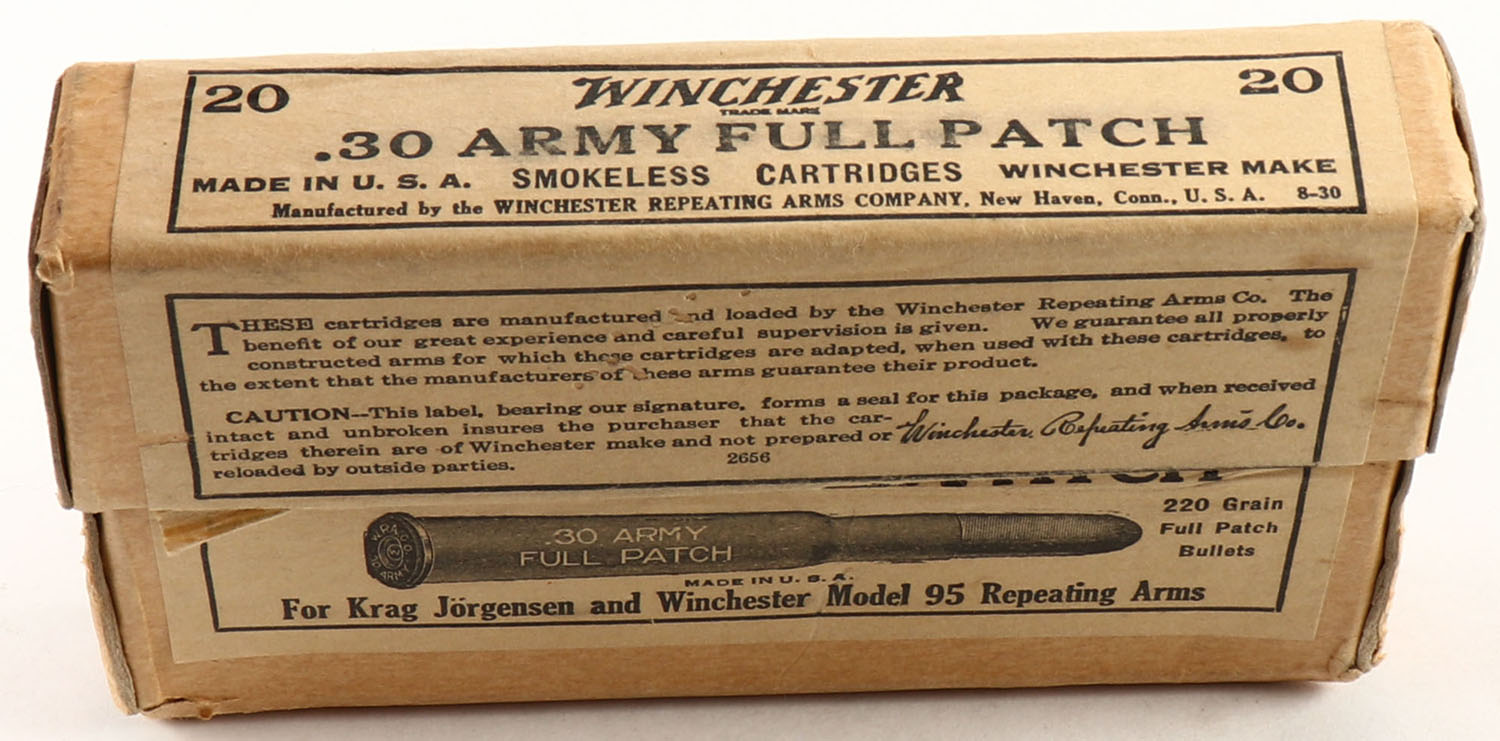 Winchester, Smokeless Cartridges, .30 Army (.30-40 Krag), 220 Grain Full Patch Bullets, Full, 2pc. Buff box with buff label, box is solid with excellent color, some corner wear, minor edge wear, label is intact, ammo is excellent to minty. Grade: Excellent - Value: 10 to 40