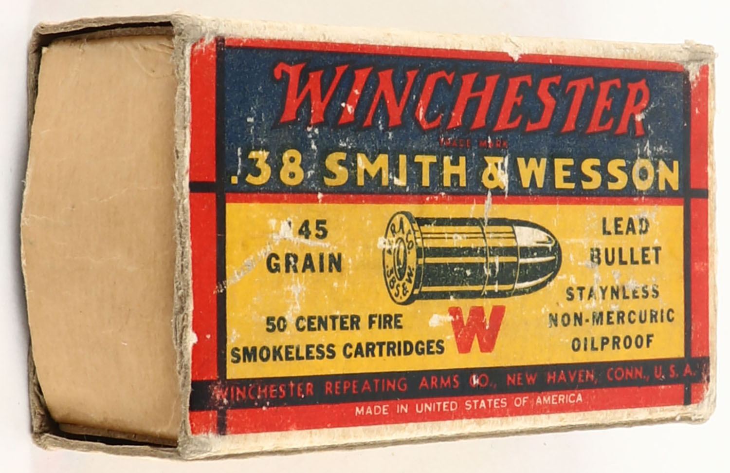 Winchester, Smokeless Cartridges, .38 Smith & Wesson, 145 Grain Lead Bullet, Partial 36rds., 1pc. Yellow blue & red box, box is missing both end flaps, excellent color, some edge & corner wear, ammo is excellent. Grade: Good ++ - Value: 16 to 60
