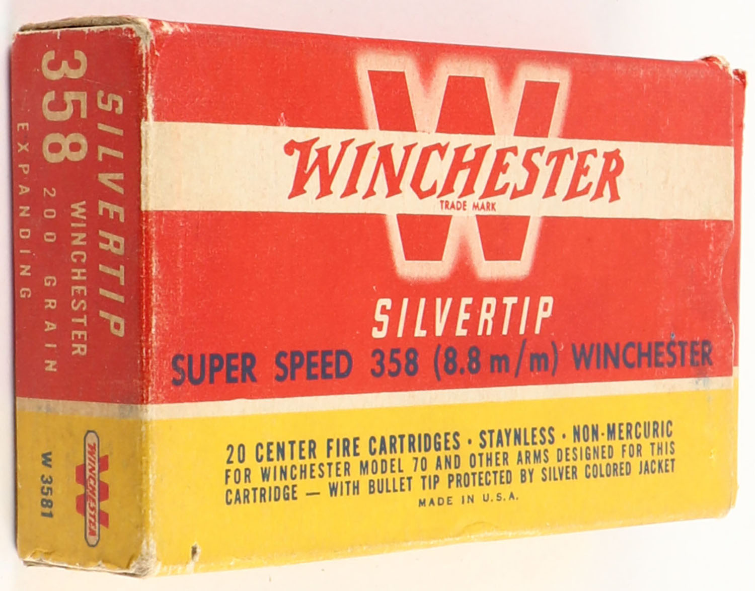 Winchester, Silvertip Super Speed, .358 Winchester (8.8mm), 200 Grain Controlled Expanding Bullet, Full, 1pc. Red yellow & white box, box is solid with excellent color, minor age soiling & shelf wear, minor corner wear, very minor edge wear, end flaps are solid, ammo is excellent. Grade: Excellent - Value: 40 to 120