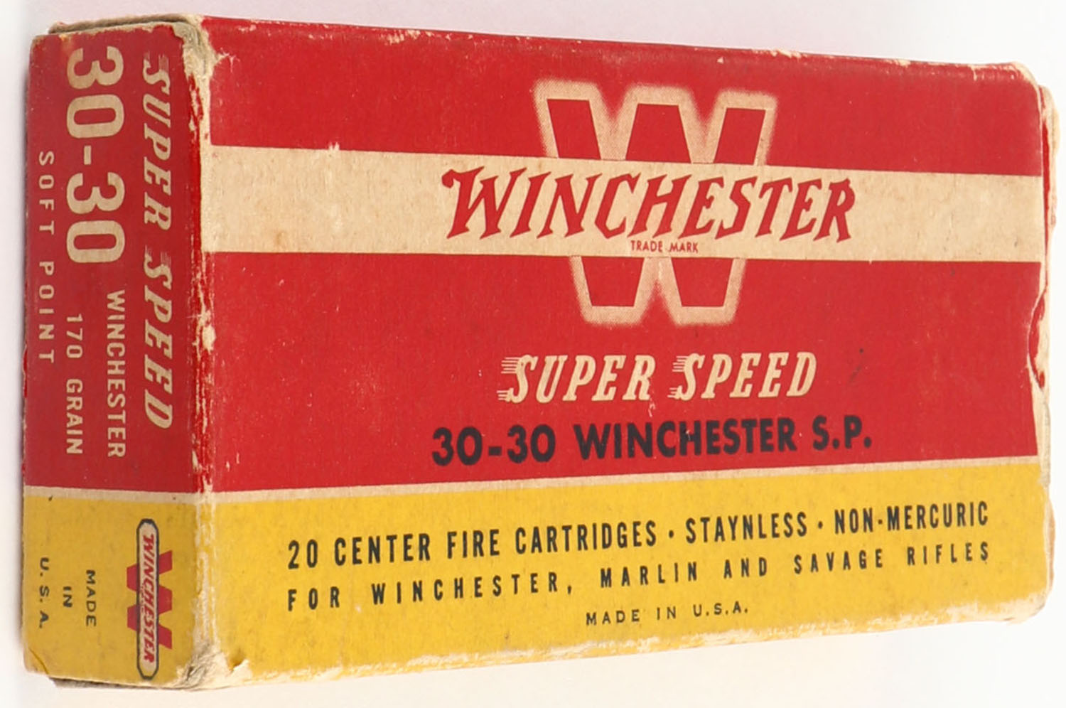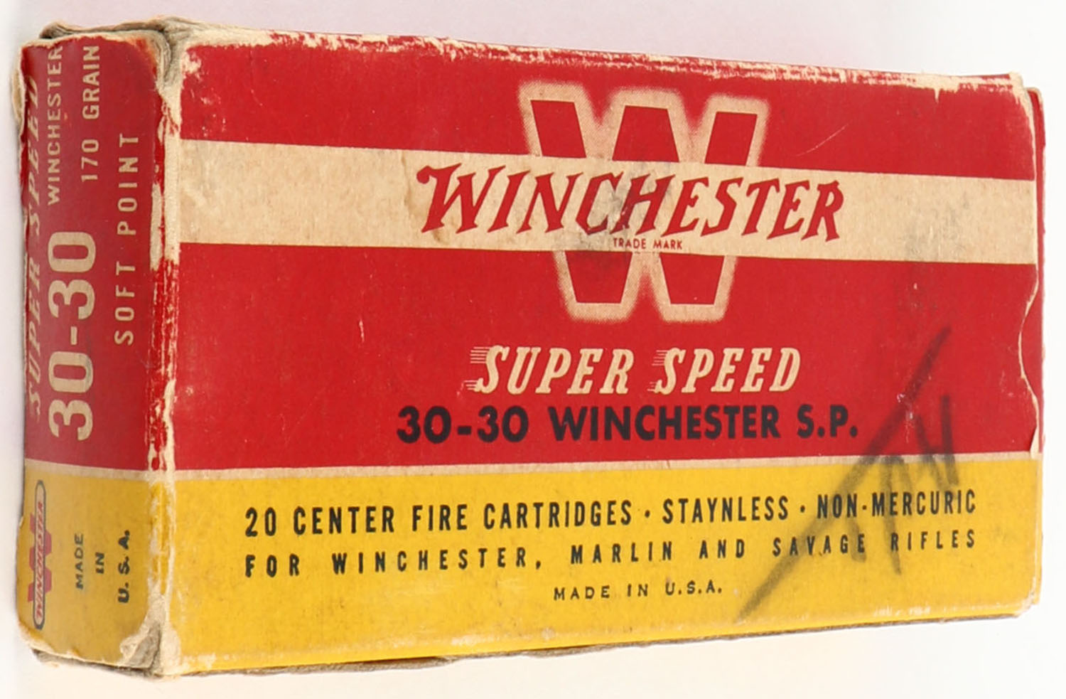 Winchester, Super Speed, .30-30 Winchester, 170 Grain Soft Point Bullet, Partial 10rds., 1pc. Red yellow & white box, box is solid with very good color, minor age soiling, bottom has been written on, corner wear, some edge wear, end flaps are solid, ammo is excellent. Grade: Very Good ++ - Value: 6 to 30