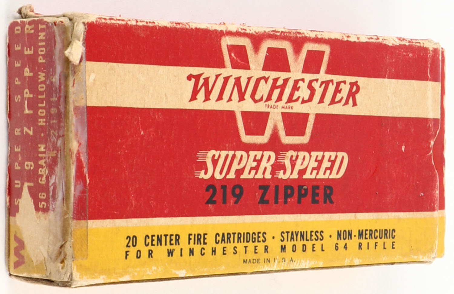 Winchester, Super Speed, .219 Zipper, 56 Grain Hollow Point, Full, 1pc. Red yellow & white box, right end flap is torn & taped, very good color, some age soiling & shelf wear, scuff on top, corner wear, minor edge wear, left end flap is solid, ammo is excellent. Grade: Very Good + - Value: 50 to 150