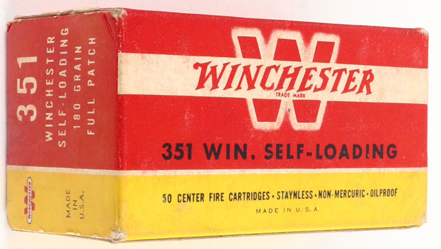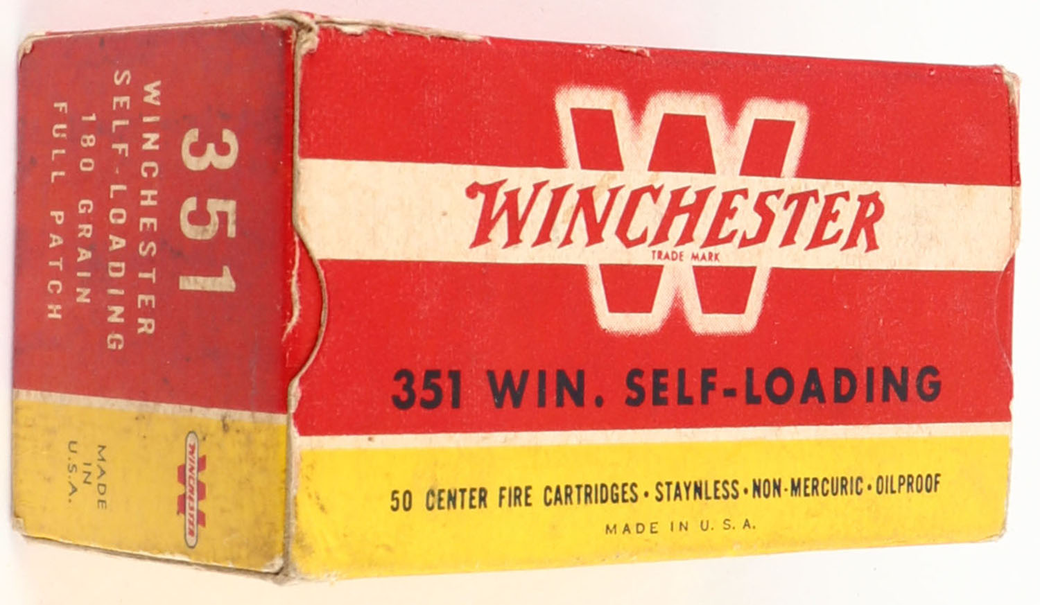 Winchester, Center Fire Cartridges, .351 Winchester Self-Loading, 180 Grain Full Patch Bullet, Full, 1pc. Red yellow & white box, box is solid with excellent color, minor age soiling, some corner wear, edges are mostly crisp, end flaps are solid, ammo is excellent. Grade: Excellent + - Value: 50 to 150