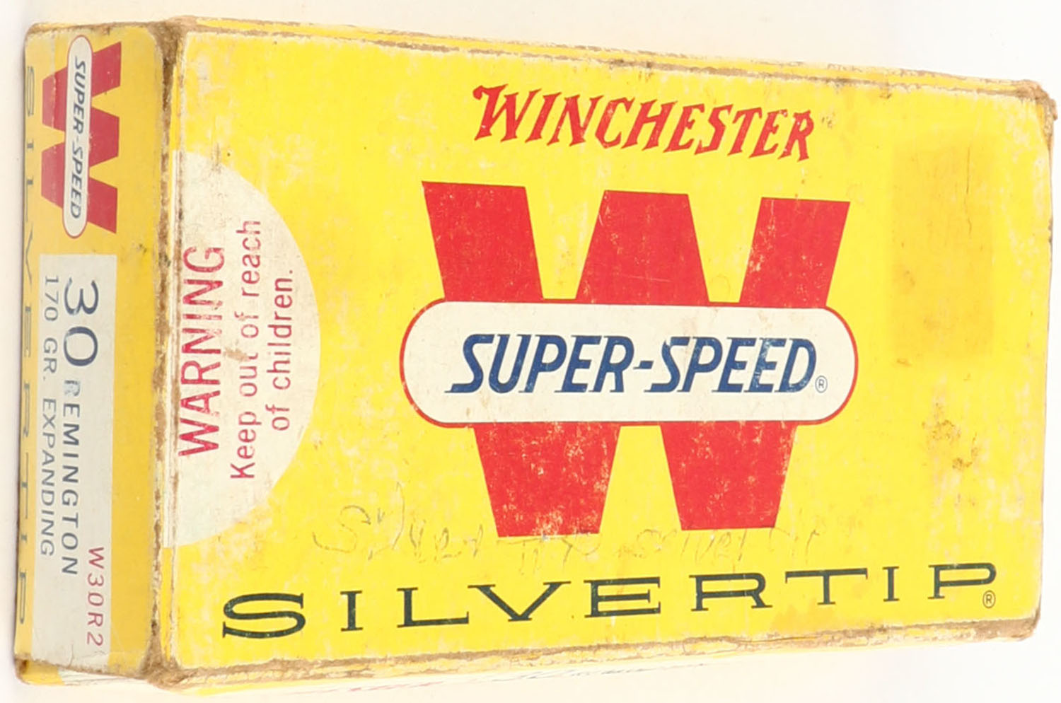 Winchester, Super-Speed Silvertip, .30 Remington, 170 Grain Expanding Bullet, Full, 1pc. Yellow white & red box, box is solid with very good color, some age soiling, top has been written on, some edge & corner wear, end flaps are solid, ammo is excellent. Grade: Very Good + - Value: 40 to 120