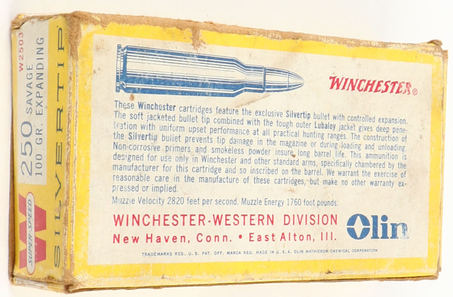 Winchester, Super-Speed Silvertip, .250 Savage, 100 Grain Expanding Bullet, Full, 1pc. Yellow white & red box, box is solid with very good color, some age soiling & shelf wear, edge & corner wear, end flaps are solid, ammo is excellent. Grade: Very Good + - Value: 20 to 60
