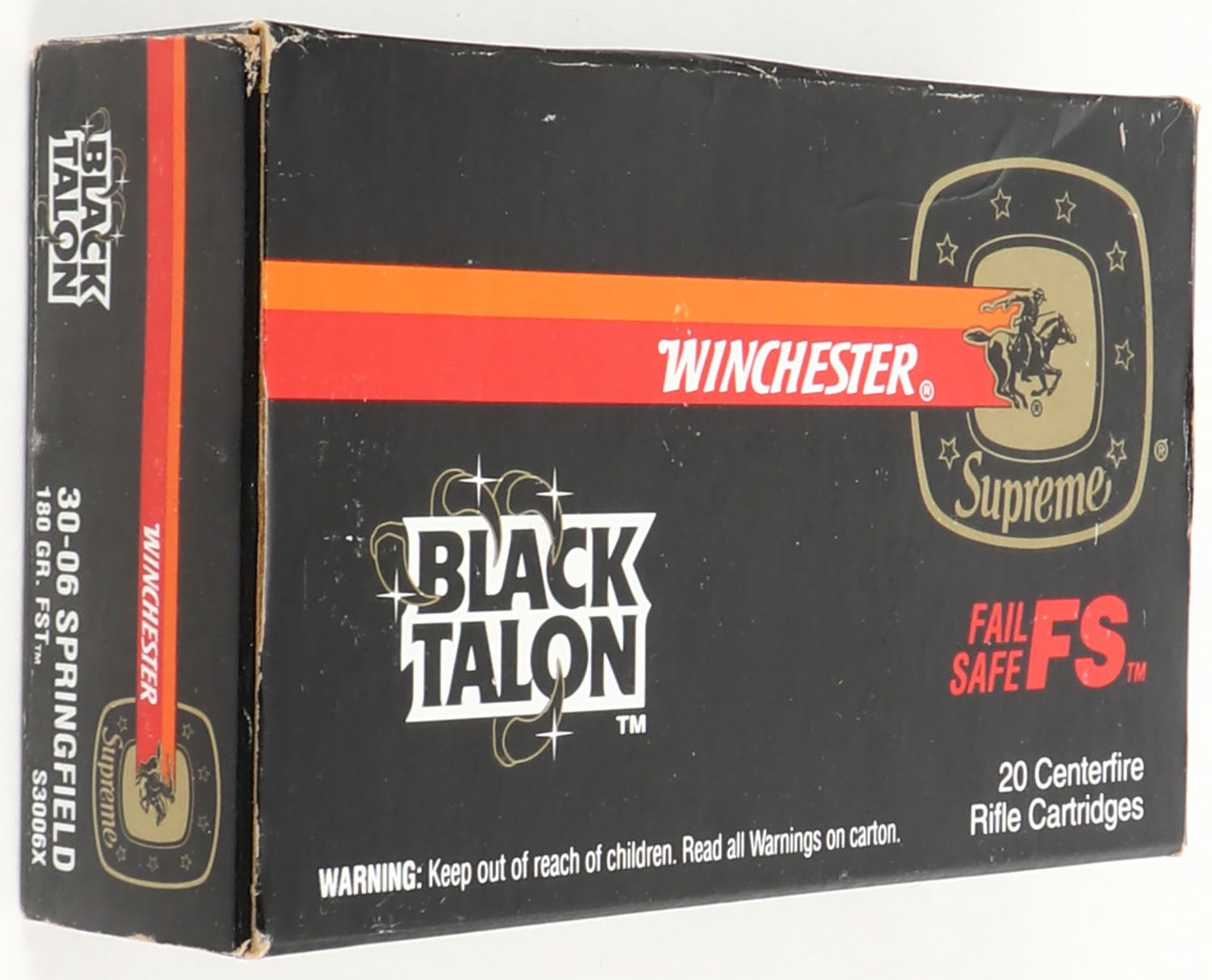 Winchester, Black Talon, .30-06 Springfield, 180 Gr. FST, Full, 1pc. Black red & orange box, box is solid with excellent color, minor shelf wear, very minor corner wear, edges are mostly crisp, end flaps are solid, ammo is minty. Grade: Excellent - Value: 30 to 90