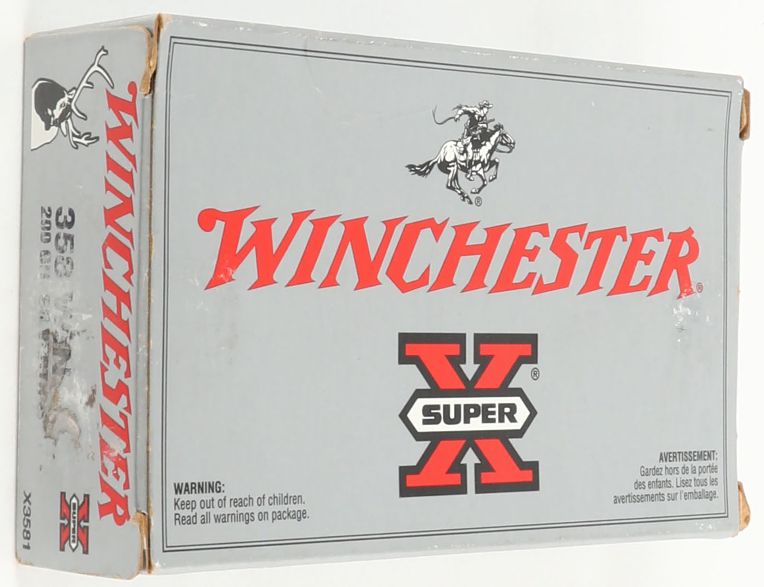 Winchester, Super X, .358 Winchester (8.8mm), 200 Grain Silvertip, Full, 1pc. Grey and red box, box is solid with excellent color, minor age soiling & corner wear, edges are mostly crisp, end flaps are solid, ammo is excellent. Grade: Excellent - Value: 20 to 60
