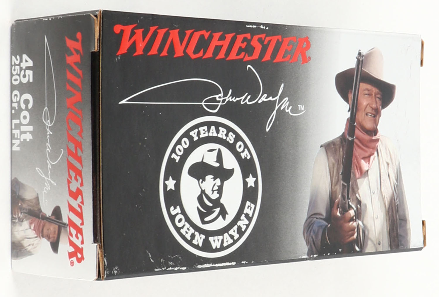 Winchester, 100 Years of John Wayne, .45 Colt, 250 Grain Lead Flat Nose, Full, 1pc. Multi-colored box, box is near mint with minty color, only very minor shelf wear, corners are sharp, edges are crisp, end flaps are solid, ammo is minty. Grade: Excellent ++ - Value: 40 to 120