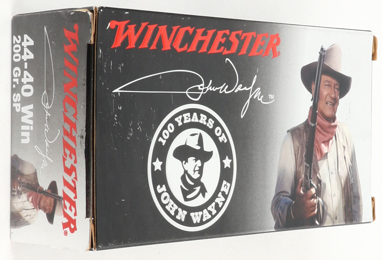 Winchester, 100 Years of John Wayne, .44-40 Winchester, 200 Grain Soft Point, Full, 1pc. Multi-colored box, box is near mint with minty color, only very minor shelf wear, corners are sharp, edges are crisp, end flaps are solid, ammo is minty. Grade: Excellent ++ - Value: 70 to 210