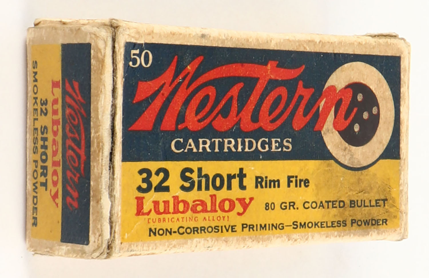 Western, Lubaloy Cartridges, .32 Short Rim Fire, 80 Grain Coated Bullet, Full, 1pc. Yellow blue & red bulls eye box, left end flap is torn & taped, very good color, some age soiling & staining, minor edge & corner wear, right end flap is solid, ammo is very good. Grade: Very Good - Value: 40 to 120