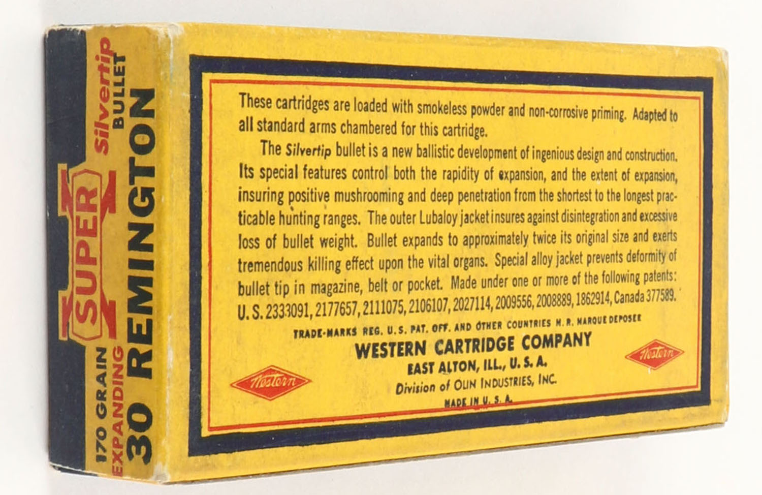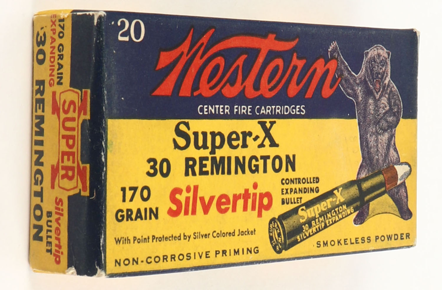 Western, Super-X Silvertip, .30 Remington, 170 Grain Controlled Expanding Bullet, Full, 1pc. Yellow blue & red bear box, box is solid with excellent color, very minor shelf & corner wear, edges are mostly crisp, end flaps are solid, ammo is excellent. Grade: Excellent + - Value: 40 to 120