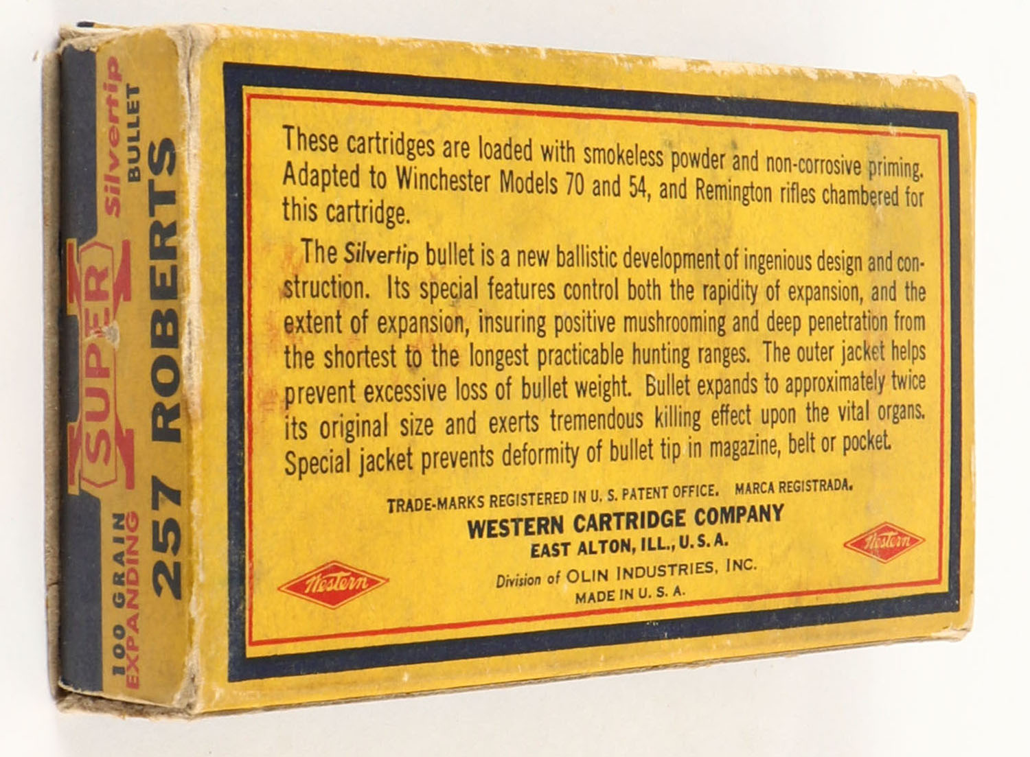 Western, Super-X Silvertip, .257 Roberts, 100 Grain Controlled Expanding Bullet, Full, 1pc. Yellow blue & red bear box, box is solid with excellent color, minor age soiling, some edge & corner wear, sticker on top, end flaps are solid, ammo is excellent. Grade: Very Good ++ - Value: 60 to 180