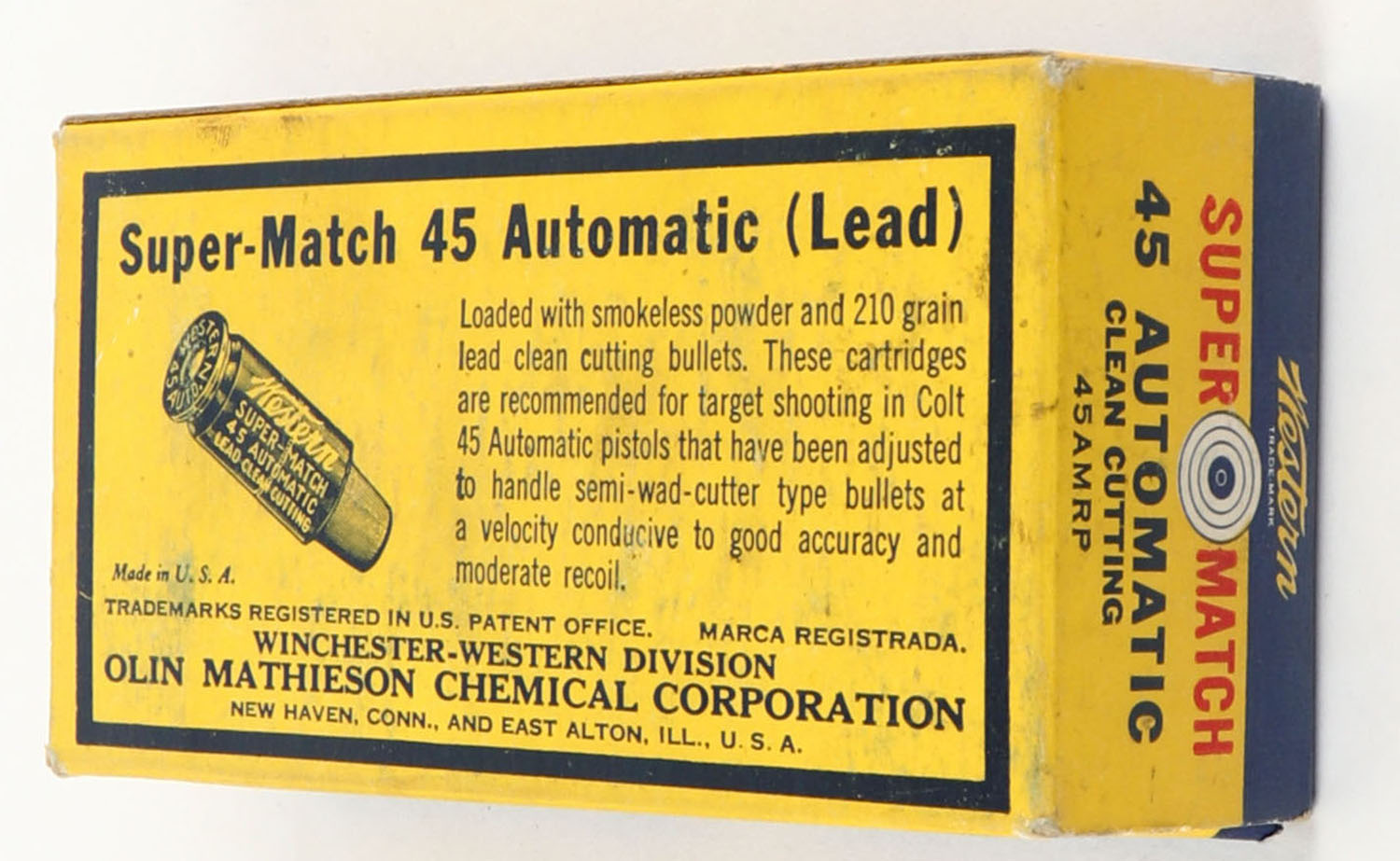 Western, Super Match, .45 Automatic, 210 Grain Lead Clean Cutting Bullet, Full, 1pc. Yellow & blue box, box is solid with excellent to minty color, very minor shelf & corner wear, edges are crisp, end flaps are solid, ammo is excellent to minty. Grade: Excellent ++ - Value: 20 to 60