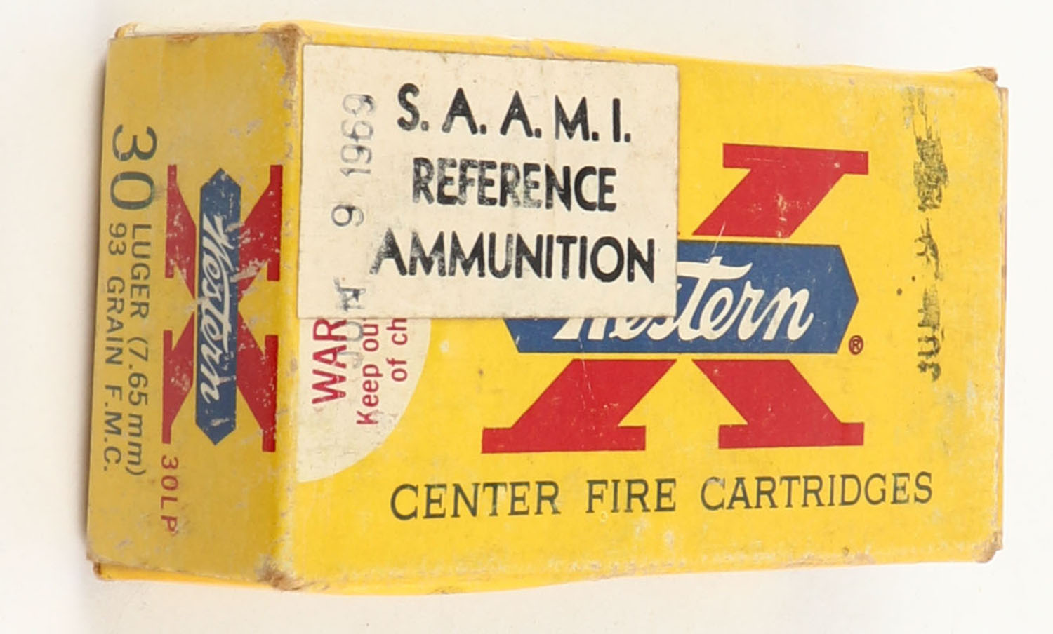 Western, X, S.A.A.M.I. Reference Ammunition, .30 Luger, 93 Grain Full Metal Case, Full, 1pc. Yellow white & red box with white SAAMI over-label, date stamps throughout (Jun 9 1969), box is solid with very good to excellent color, very minor age soiling & shelf wear, minor edge & corner wear, end flaps are solid, ammo is excellent. Grade: Excellent - Value: 16 to 60