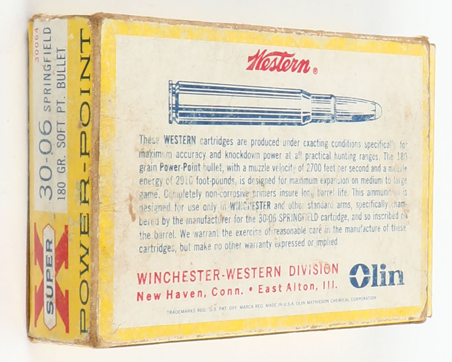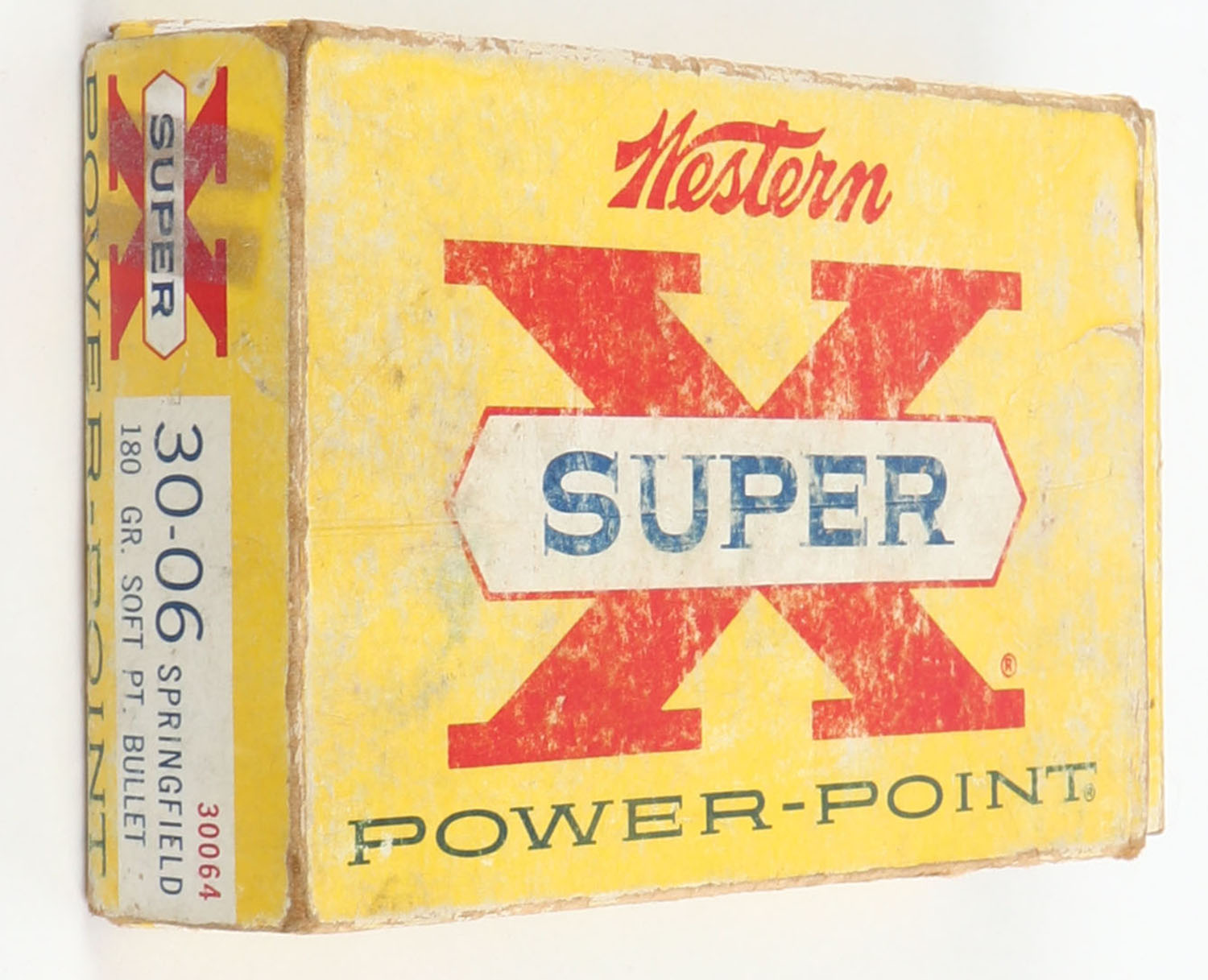 Western, Super X Power-Point, .30-06 Springfield, 180 Grain Soft Point Bullet, Partial 18rds., 1pc. Yellow white & red box, box is solid with good color, some age soiling, shelf wear, some edge & corner wear, end flaps are solid, ammo is excellent. Grade: Very Good + - Value: 10 to 40