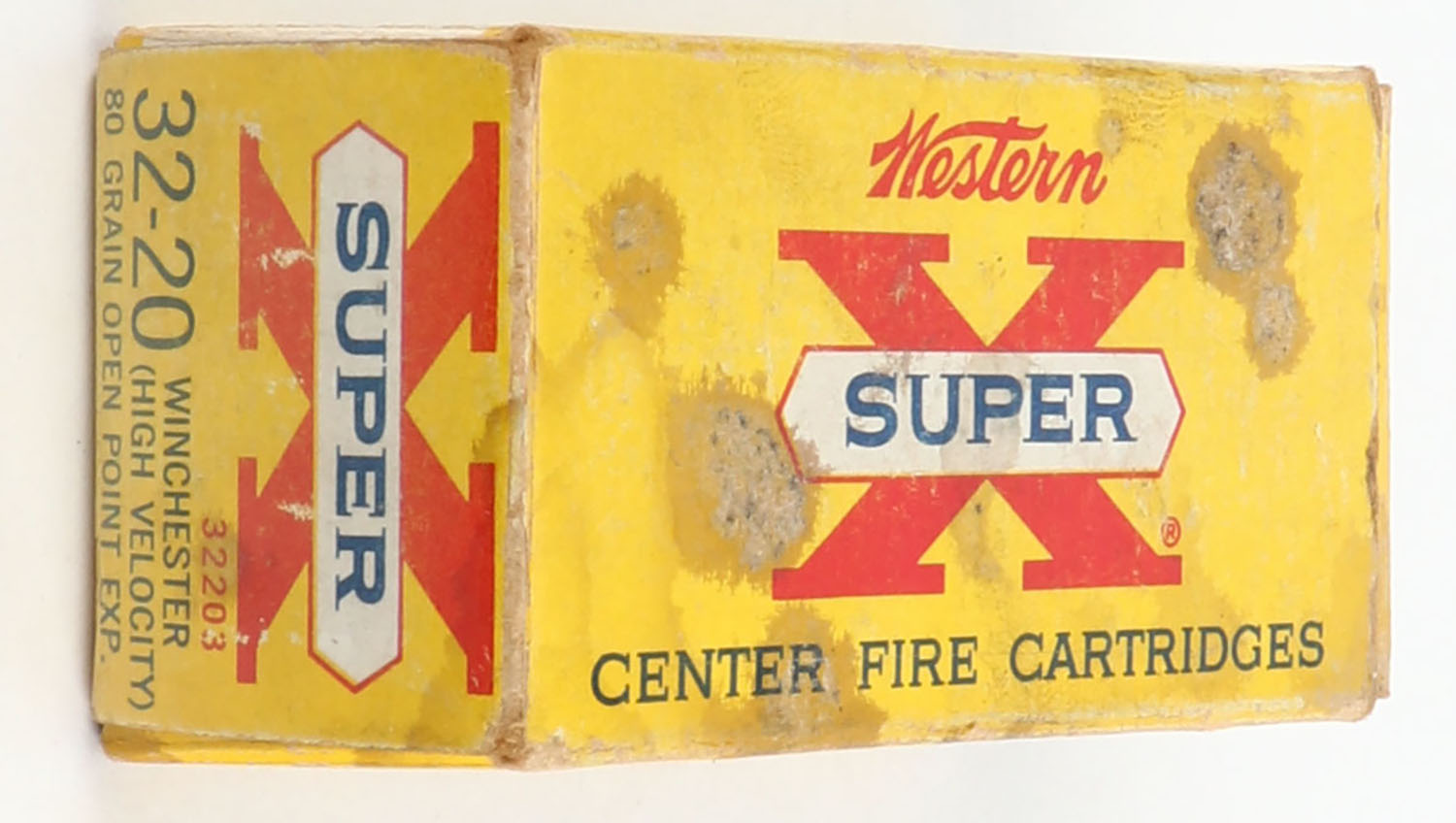 Western, Super X, .32-20 Winchester, 80 Grain Open Point Expanding, Partial 36rds., 1pc. Yellow white & red box, box is solid with very good color, staining all over box, some corner wear, minor edge wear, end flaps are solid, ammo is excellent. Grade: Very Good + - Value: 20 to 60