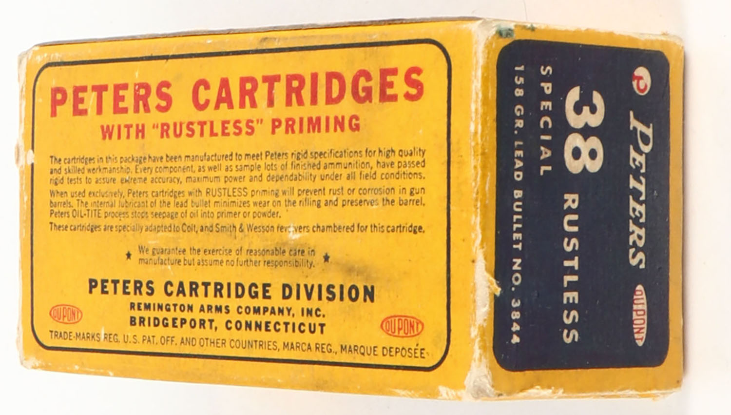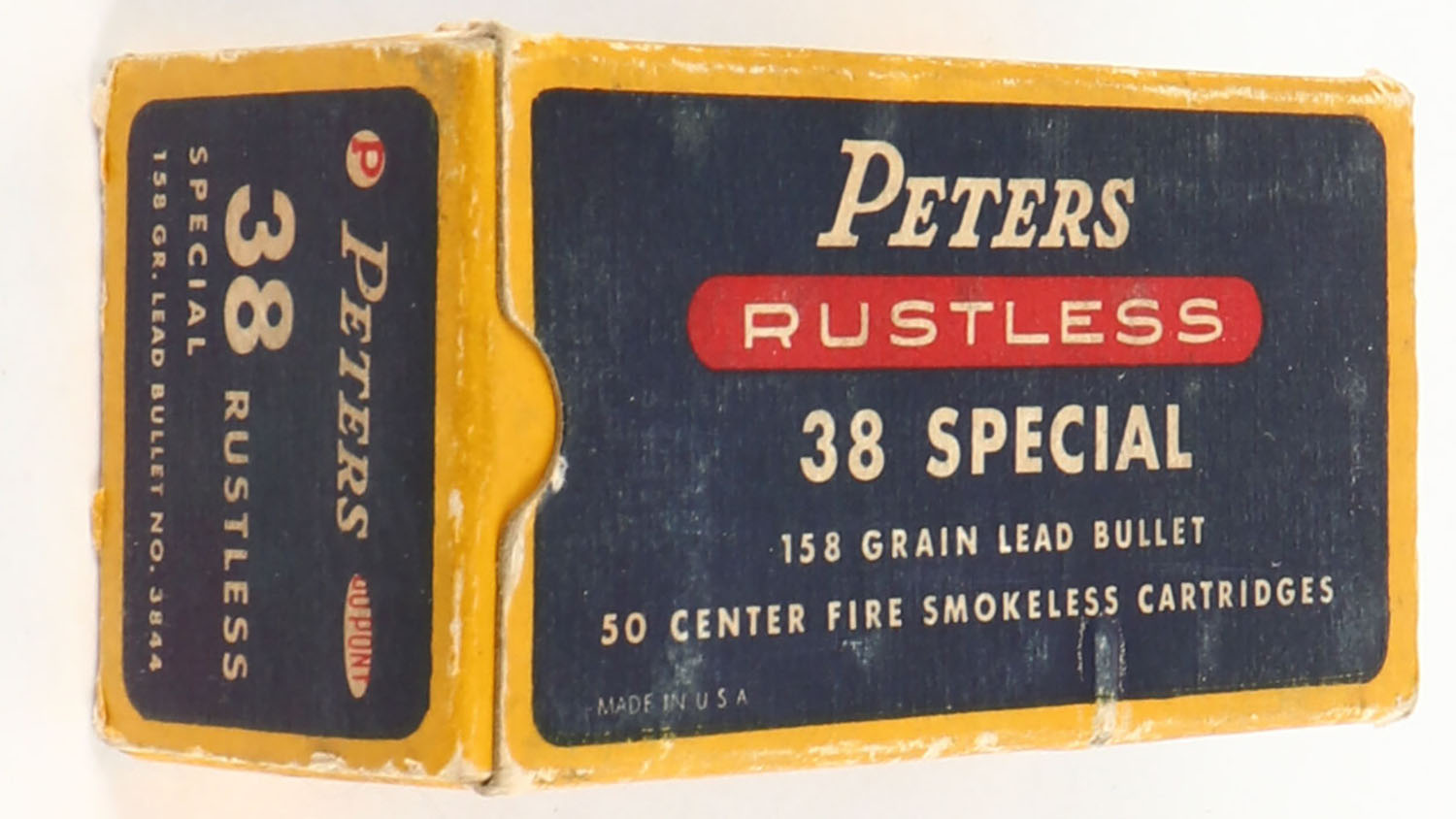Peters, Rustless, .38 Special, 158 Grain Lead Bullet, Full, 1pc. Blue yellow & red box, box is solid with excellent color, minor shelf wear, some corner wear, very minor edge wear, end flaps are solid, ammo is excellent. Grade: Excellent - Value: 14 to 40