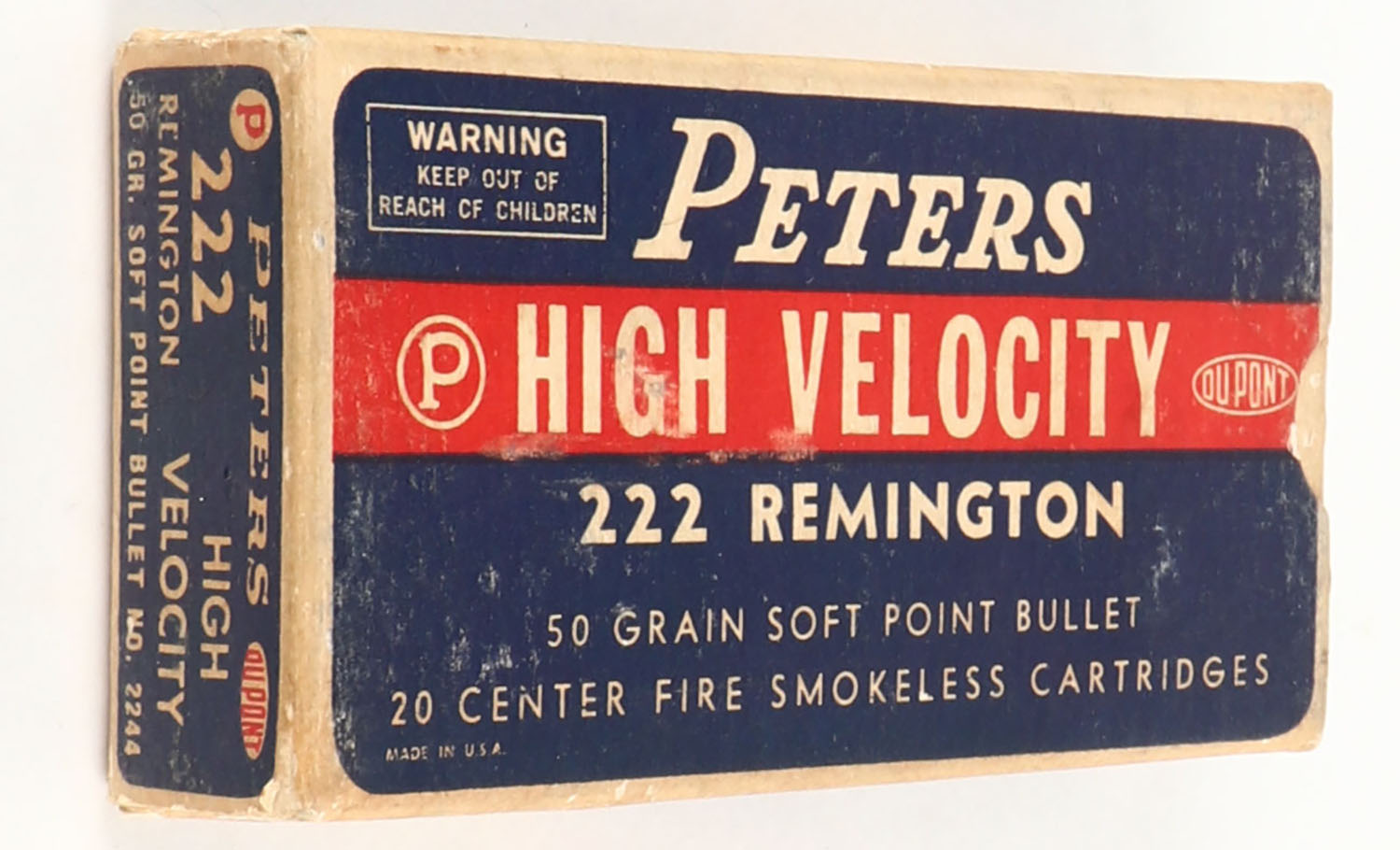 Peters, High Velocity, .222 Remington, 50 Grain Soft Point Bullet, Full, 1pc. Blue white & red box, box is solid with very good color, minor age soiling, some shelf wear, very minor corner wear, edges are crisp, end flaps are solid, ammo is excellent. Grade: Very Good ++ - Value: 20 to 60
