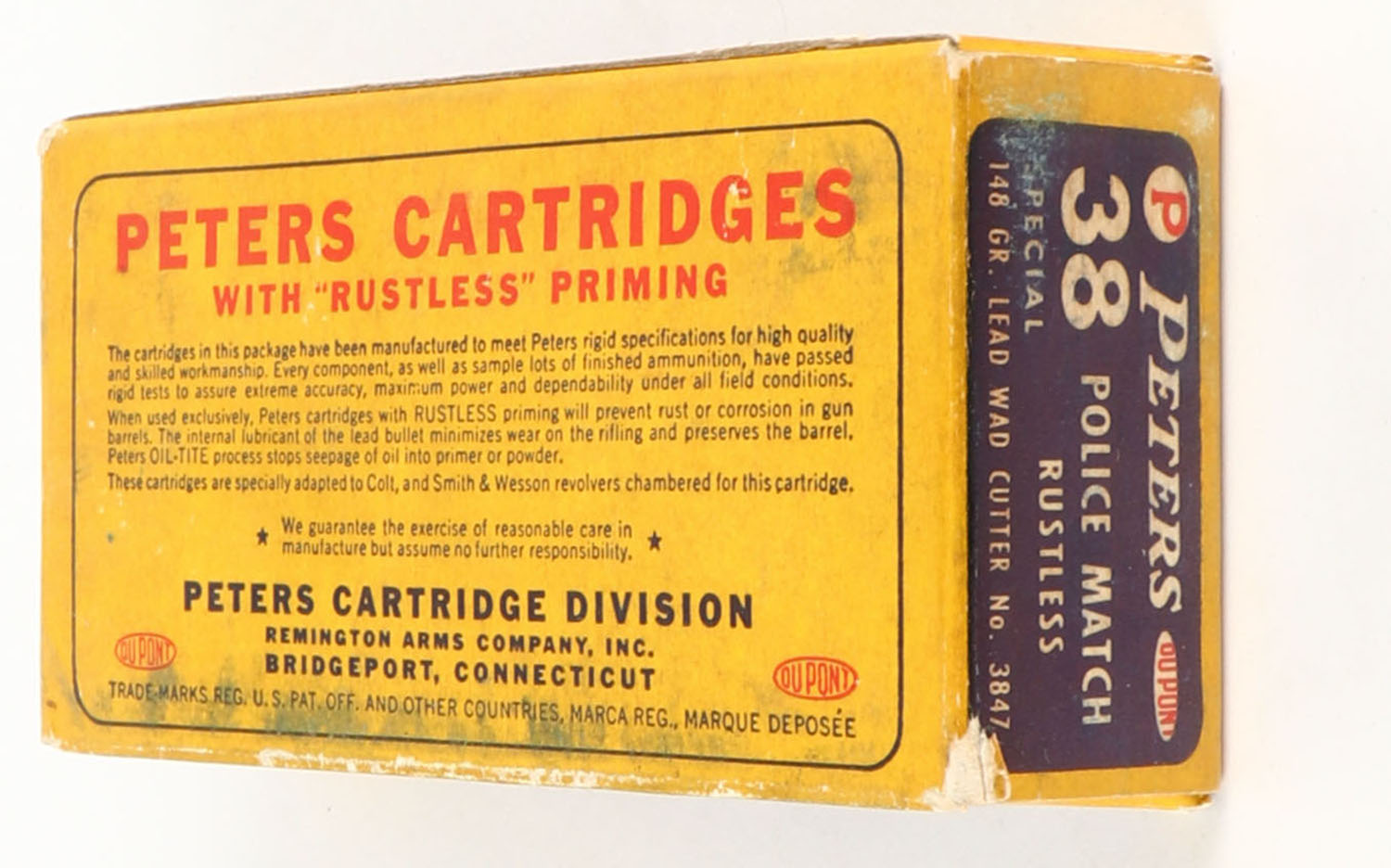 Peters, Police Match, .38 Special, 148 Grain Lead Wad Cutter, Full, 1pc. Yellow blue & red box, box is solid with excellent color, minor age soiling, some shelf wear on front, very minor corner wear, edges are crisp, end flaps are solid, ammo is excellent. Grade: Excellent. Grade: Excellent - Value: 20 to 60
