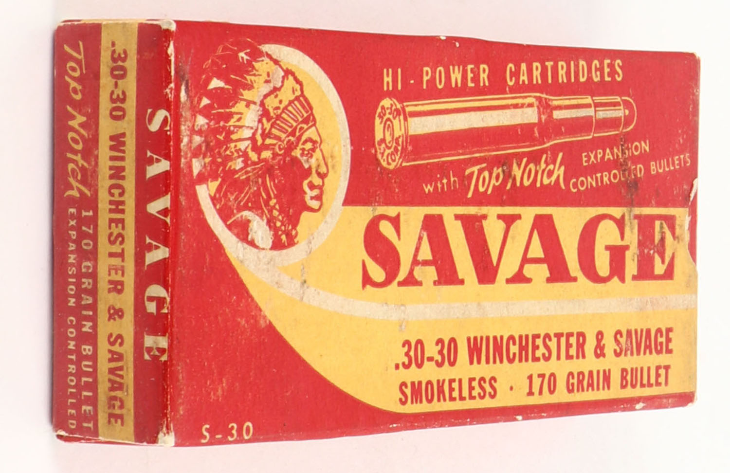Savage, Hi-Power Cartridges, .30-30 Winchester, 170 Grain Bullet, Full, 1pc. Red & yellow box, box is solid with very good color, minor age soiling, factory seam has unadhered, some shelf & corner wear, very minor edge wear, end flaps are solid, ammo is excellent. Grade: Very Good ++ - Value: 60 to 180