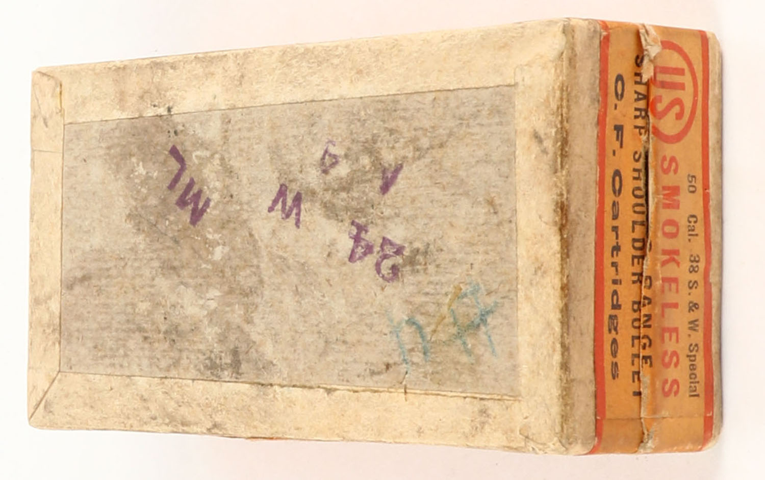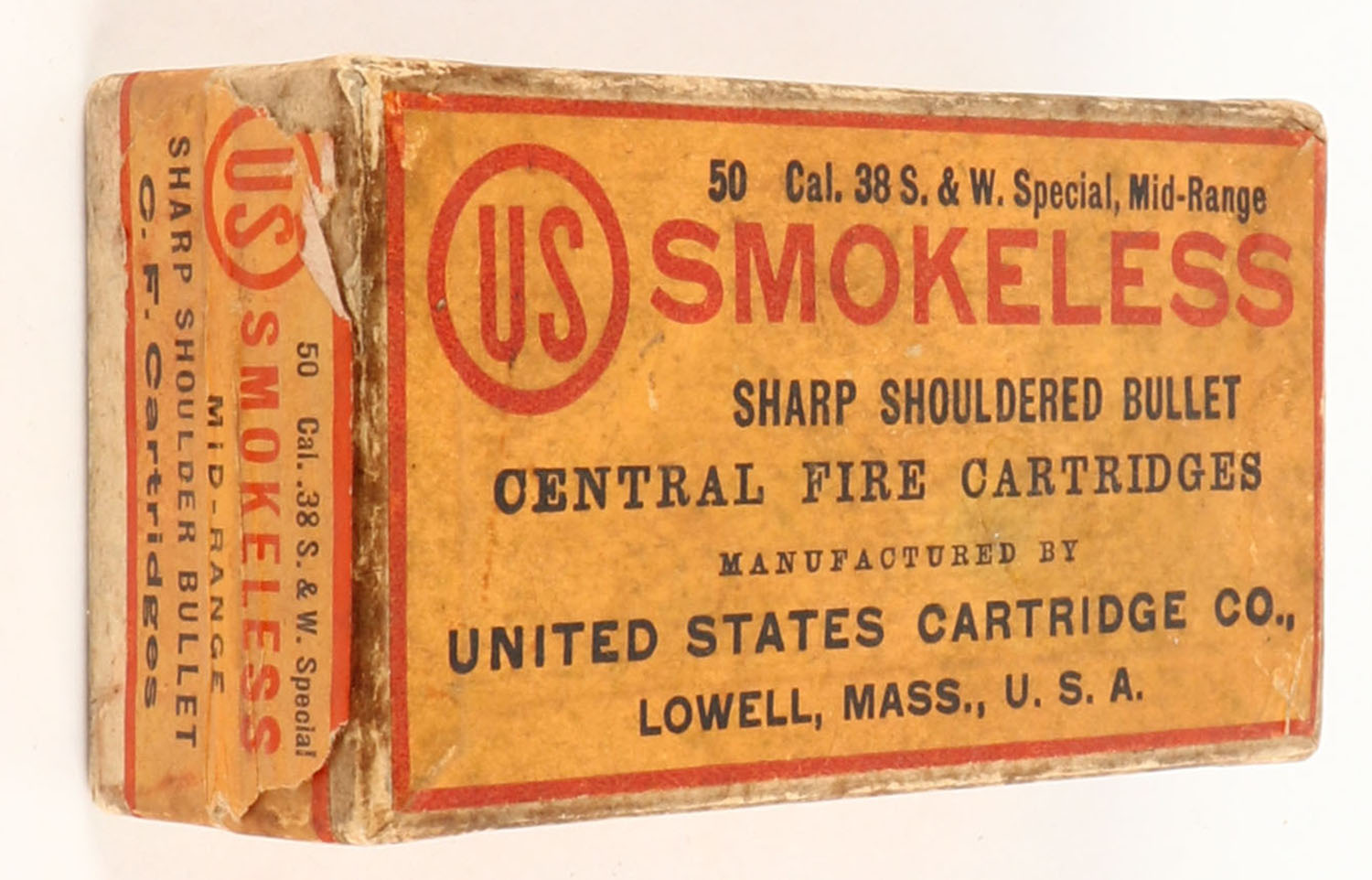 U.S., Smokeless, .38 Smith & Wesson Special, Mid-Range, Sharp Shouldered Bullet, Full (36rds. unfired, 14rds. fired brass) 2pc. Buff box with orange top & side sealing labels, box is solid with very good color, some age soiling & corner wear, minor edge wear, labels are intact, unfired ammo is excellent, fired brass is fair. Grade: Excellent - Value: 16 to 60