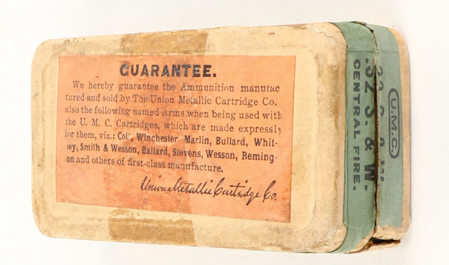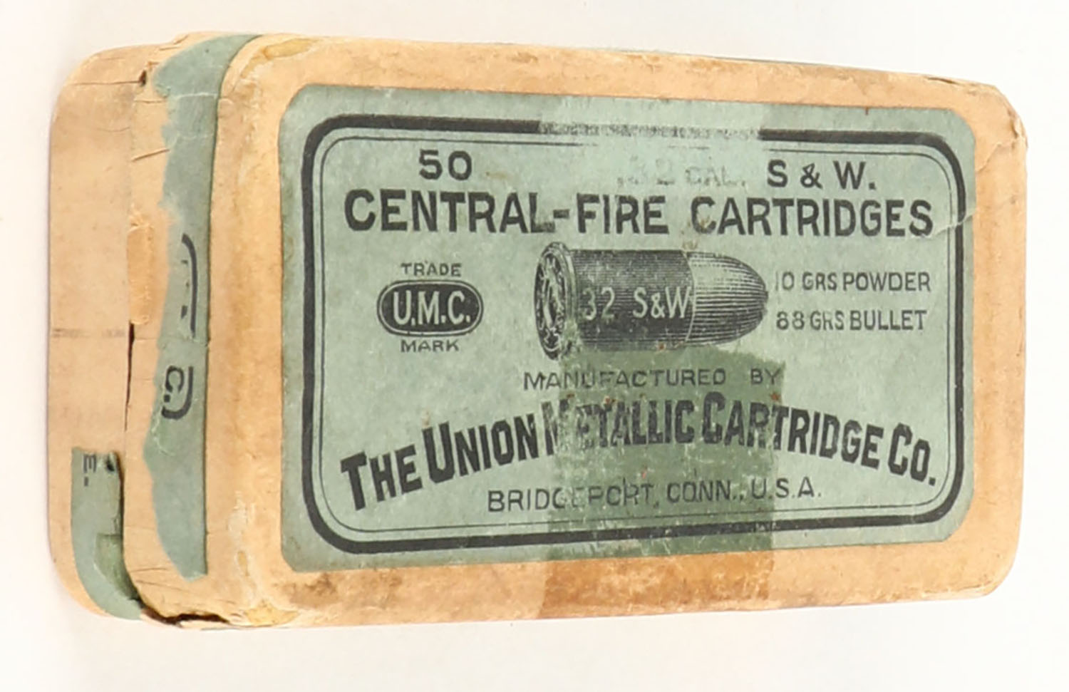 UMC, Central-Fire Cartridges, .32 Smith & Wesson, 88 Grain Bullet, Full, 2pc. Buff box with blue top & side sealing labels, box is solid with very good color, some age soiling, tape stain around middle of box, some corner wear, very minor edge wear, labels are intact, ammo is very good to excellent. Grade: Very Good ++ - Value: 16 to 60