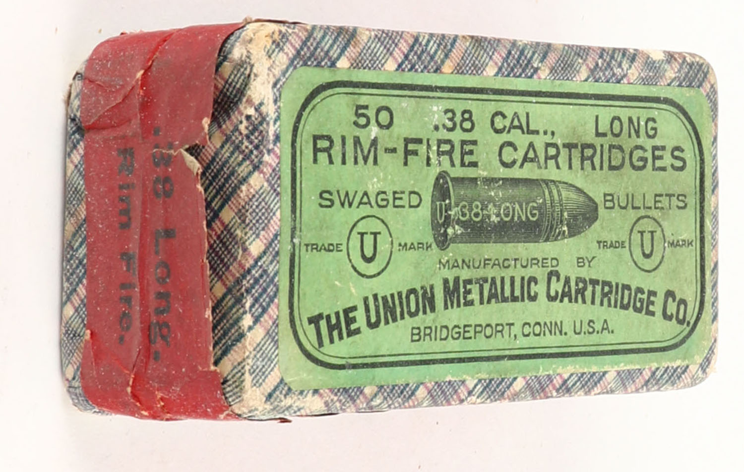 UMC, Rim-Fire Cartridges, .38 Long Rim Fire, Swaged Bullets, FULL & SEALED, 2pc. Purple fabric box with green top & red side sealing labels, box is solid with excellent color, some shelf wear, minor corner wear, very minor edge wear, labels are intact. Grade: Excellent - Value: 30 to 90