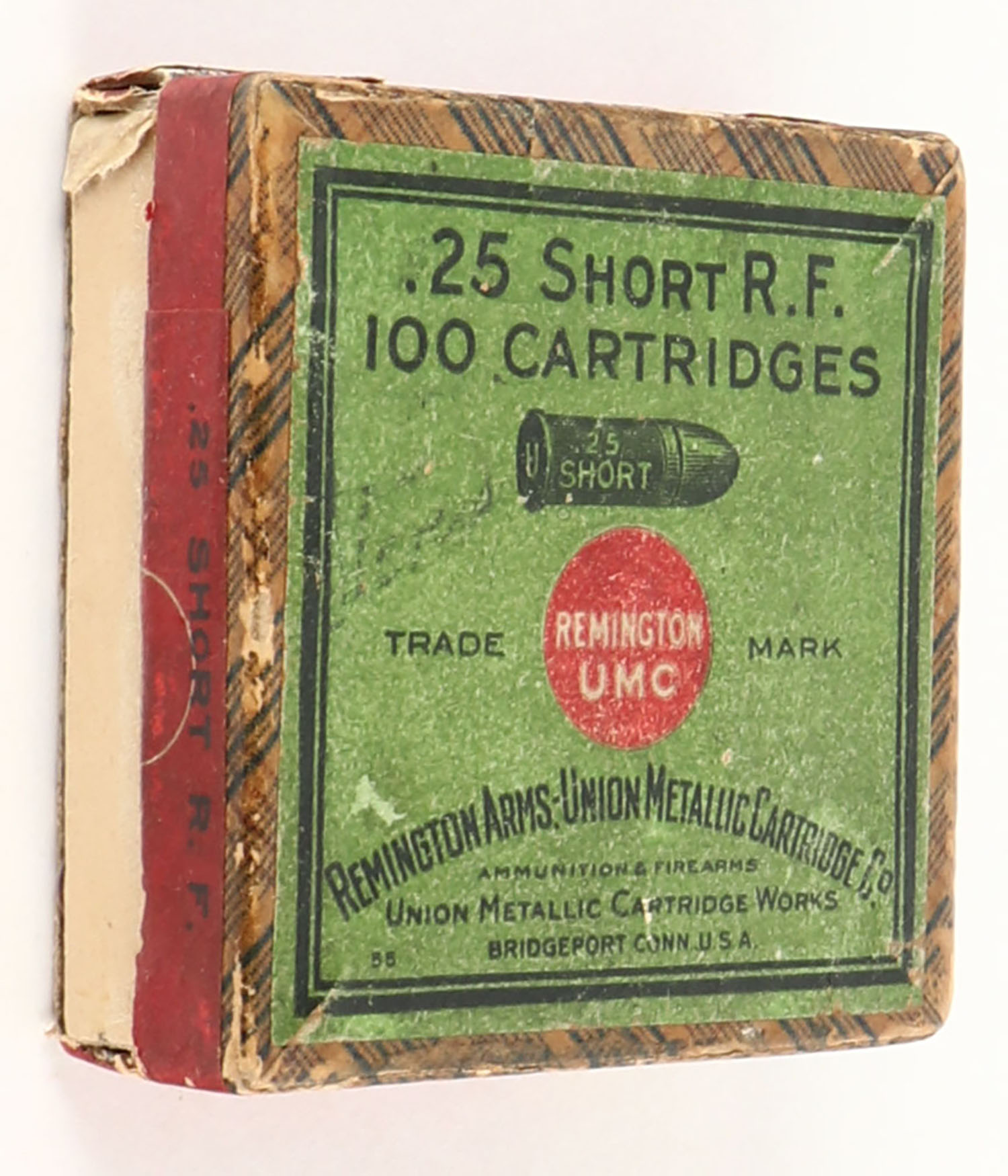REM-UMC, R.F. Cartridges, .25 Short Rim Fire, Full, 2pc. Purple fabric box with green top & red side sealing labels, box is missing right end of bottom, very good color, some age soiling, minor shelf wear, some edge & corner wear, side sealing label is 80% intact, ammo is good. Grade: Very Good - Value: 40 to 120