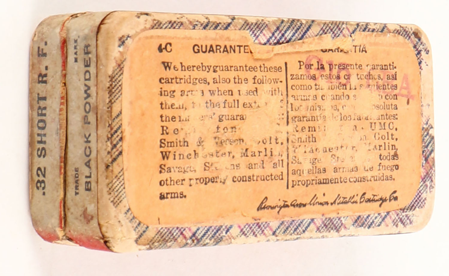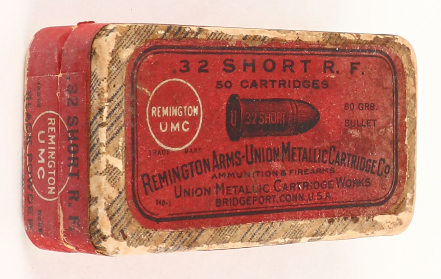 REM-UMC, R.F. Cartridges, .32 Short Rim Fire, 80 Grain Bullet, Full, 2pc. Buff box with red top & side sealing labels, box is solid with very good color, some age soiling & shelf wear, edge & corner wear, labels are intact, ammo is good. Grade: Very Good + - Value: 40 to 120